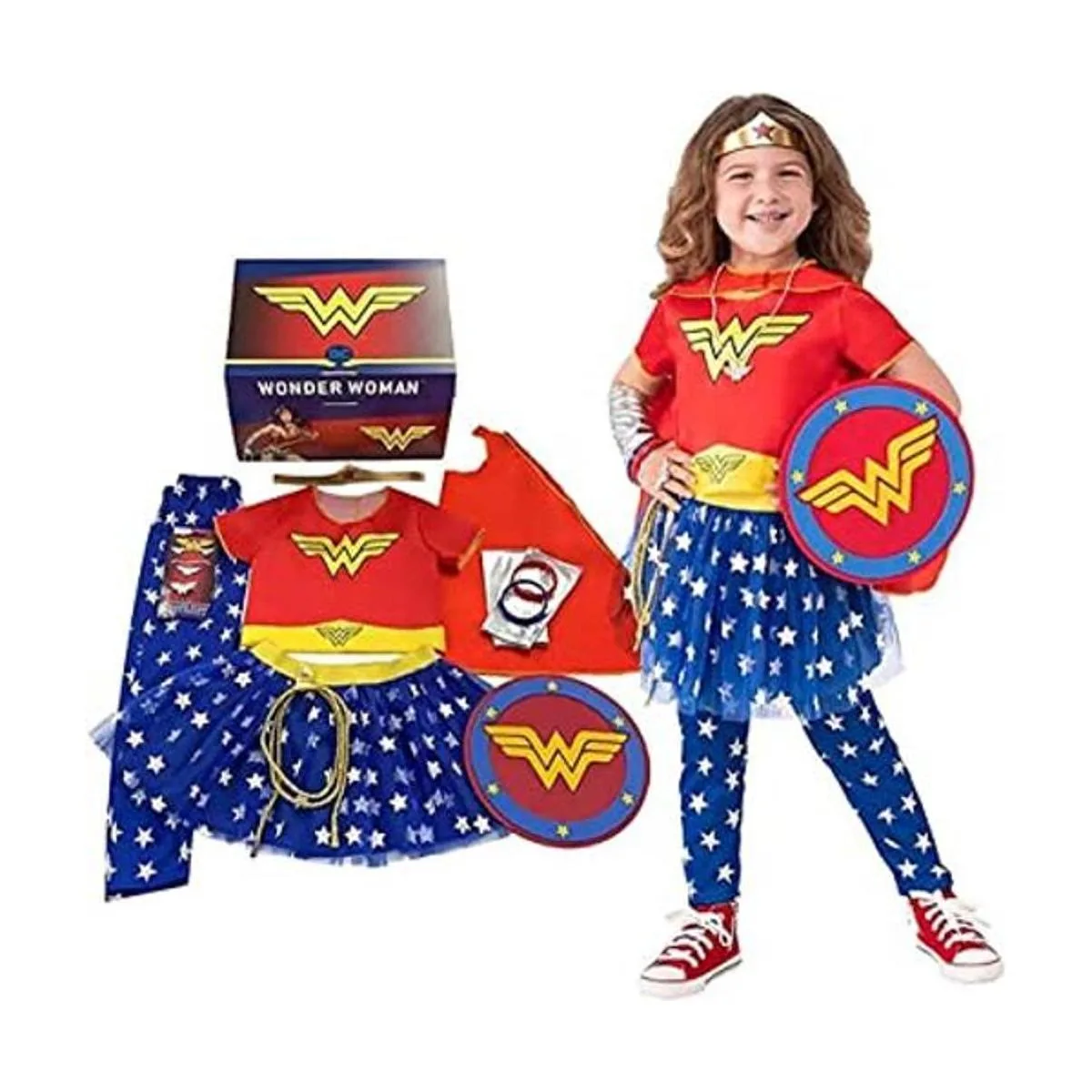 Imagine by Rubies Wonder Woman Traje de juego de superhéroes, juego de rol de disfraces múltiples. Disponible en talla S, consulta la tabla de tallas en las imágenes para las medidas. El divertido juego incluye 16 piezas: baúl, camiseta de manga corta con logotipo de Wonder Woman en la parte delantera, falda con lazo en el cinturón para sostener el lazo, capa de 15 pulgadas, leggings, tiara de tela con cierre elástico y de velcro, lazo, escudo de espuma de 10 pulgadas, 2 puños de tela, par de aretes de mujer maravillosa, collar de mujer maravilla y dos pulseras de pulsera. Es un gran regalo. Mucha diversión. Todos los productos Imagine están probados para cumplir o superar todos los estándares federales para la importación de nosotros. Los diseños de alta calidad están desarrollados para atraer a padres e hijos por igual e incluyen muchos diseños populares con licencia, así como clásicos populares como ninjas, policías, bomberos, militares, princesas y hadas, así como accesorios que incluyen: capas reversibles, espadas, máscaras, tutus, bolsos, varitas y tiaras. Inspira a los niños a salir y jugar y experimentar una buena diversión pasada de moda a través de su imaginación y creatividad, todos los días del año.
