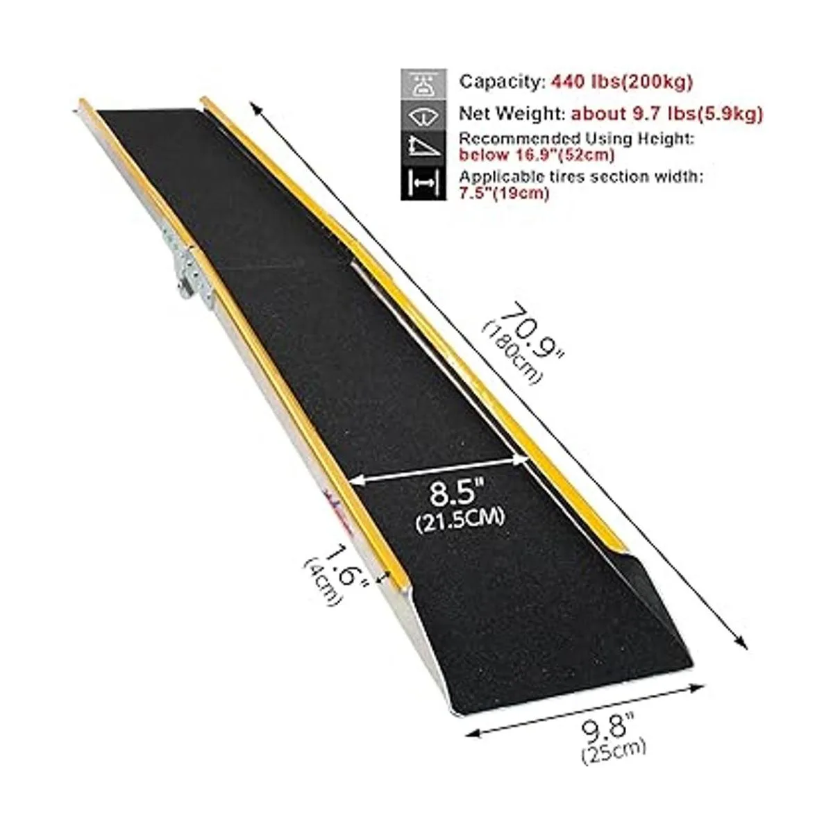 Ligera y fácil de transportar: la rampa de carga plegable está fabricada con aluminio ligero con aproximadamente 13.0 lbs. Tamaño desplegado: 70.9 pulgadas de largo x 9.8 pulgadas de ancho x 1.6 pulgadas de alto. Ancho interior: 8.5 in. Tamaño plegado: 36.0 x 9.8 x 5.7 in. Diseño plegable para un fácil transporte y almacenamiento. Bisagras, juntas y barras transversales resistentes están soldadas, lo que permite que la rampa se pliegue y despliegue innumerables veces sin mal funcionamiento.