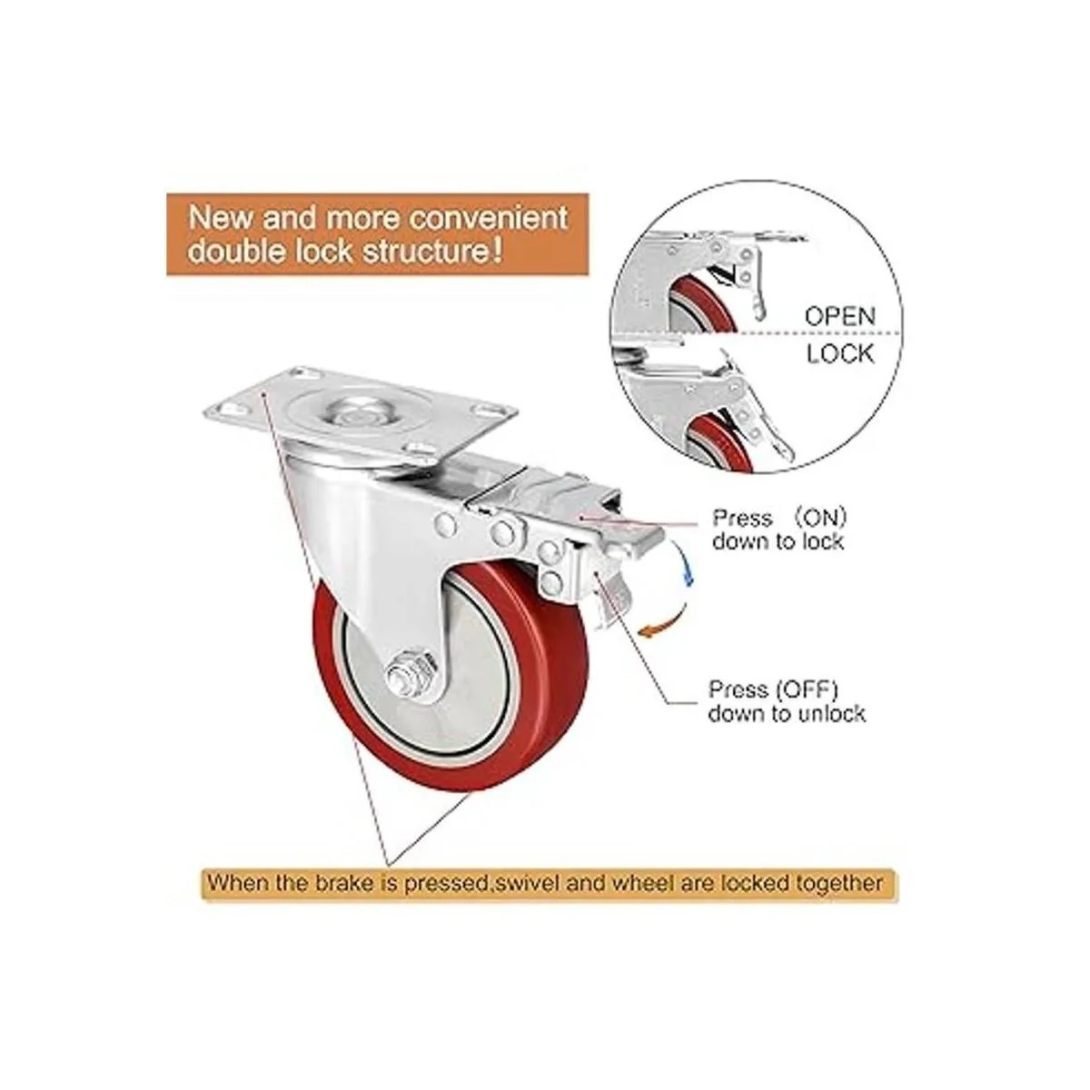 Las ruedas están hechas de goma de poliuretano que no deja marcas, absorben golpes y vibraciones. El rodamiento de bolas y el doble bloqueo ofrecen una máxima capacidad de carga y seguridad.