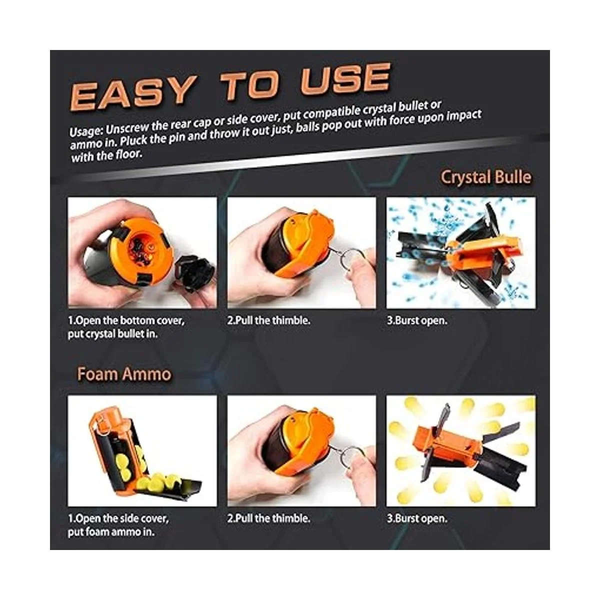 Fácil de usar: desenrosca la tapa trasera, carga las cuentas de agua de bala de cristal o abre la cubierta lateral y coloca balas de espuma compatibles, tira el pin y tira como una mano, las bolas salen con fuerza al impacto con el suelo, las bolas de munición compatibles se disparan a una velocidad bastante alta.