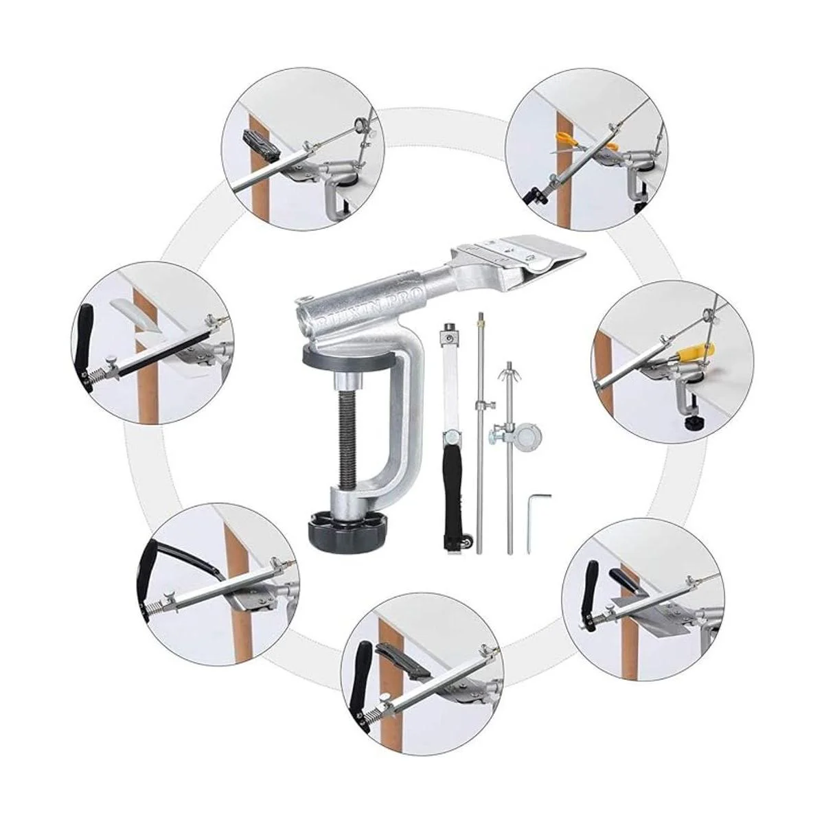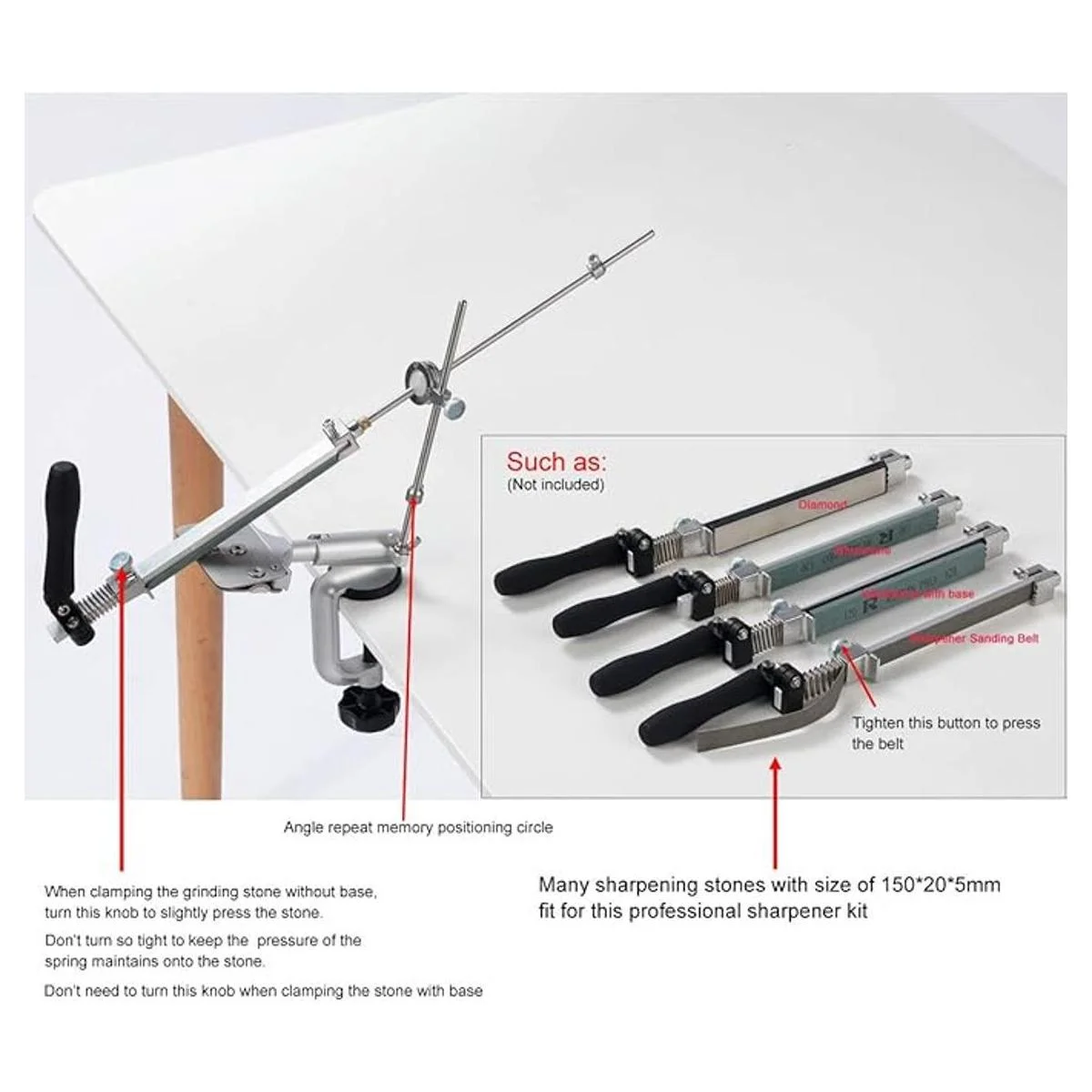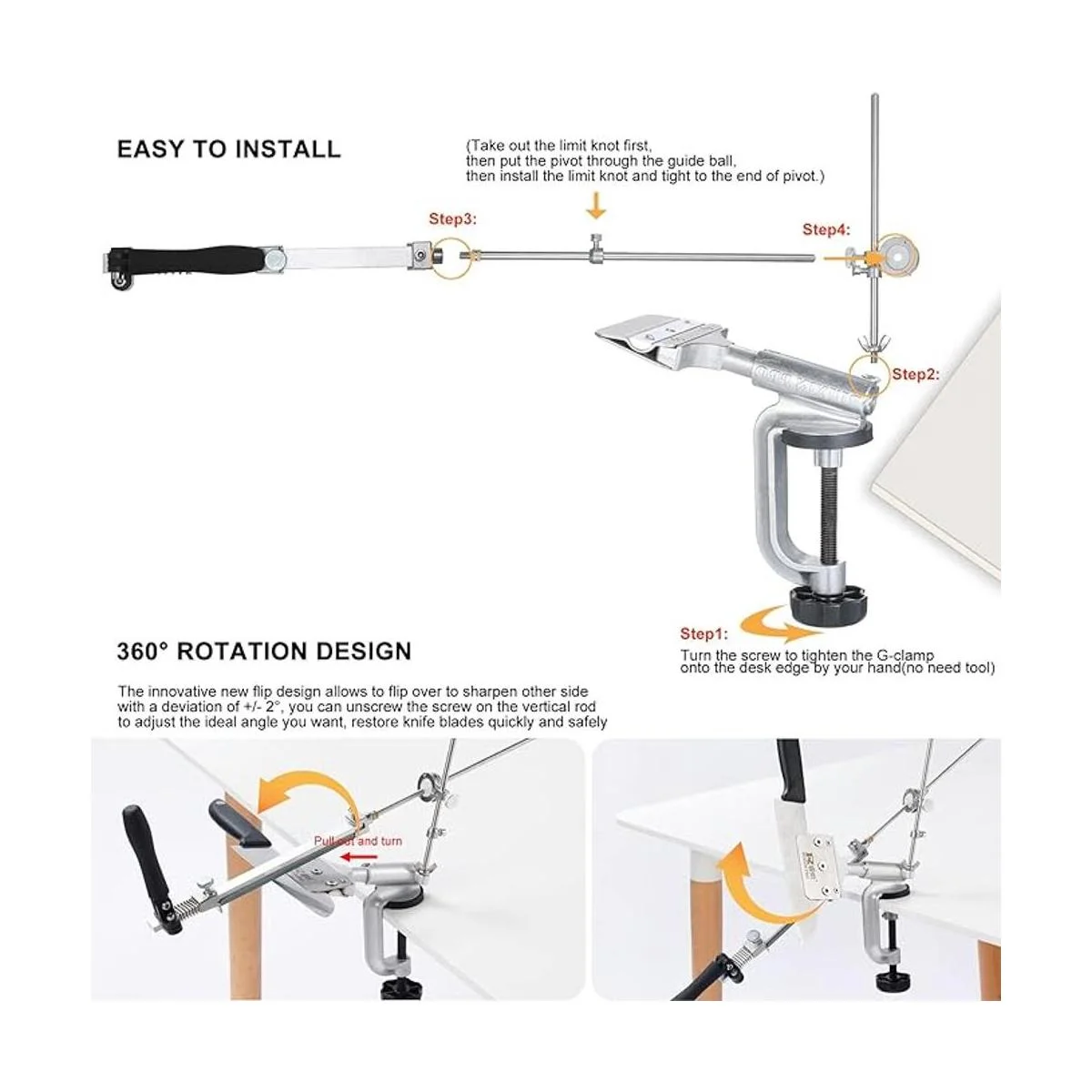 Diseño de rotación de 360: el innovador diseño de giro permite girar para afilar el otro lado con una desviación de / 2, puedes desenroscar el tornillo en la barra vertical para ajustar el ángulo ideal que desees, restaurar las cuchillas de cuchillo de forma rápida y segura