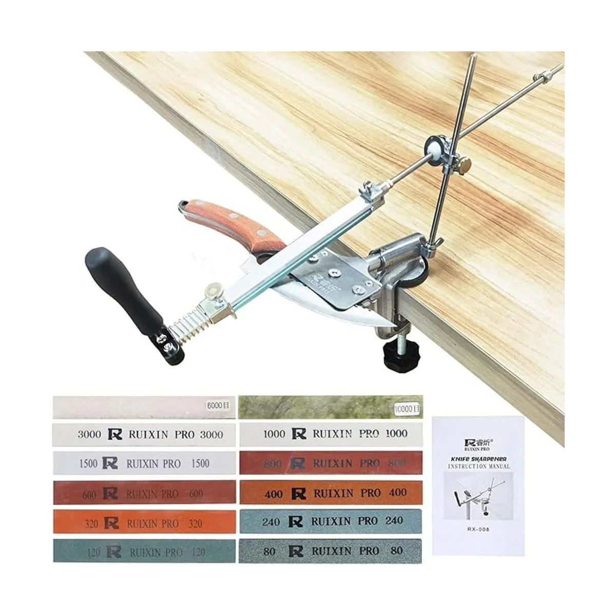 Afilador de ángulo fijo de metal RUIXIN RX008: este afilador de borde de ángulo fijo de metal RX008 es más simple en estructura, se puede sujetar firmemente en la mesa, estufa de cocina u otras plataformas con la abrazadera G, y un accesorio de hoja de metal que sujeta la hoja firmemente. La mayoría del material de este soporte de afilador es de acero inoxidable, altamente duradero y duradero