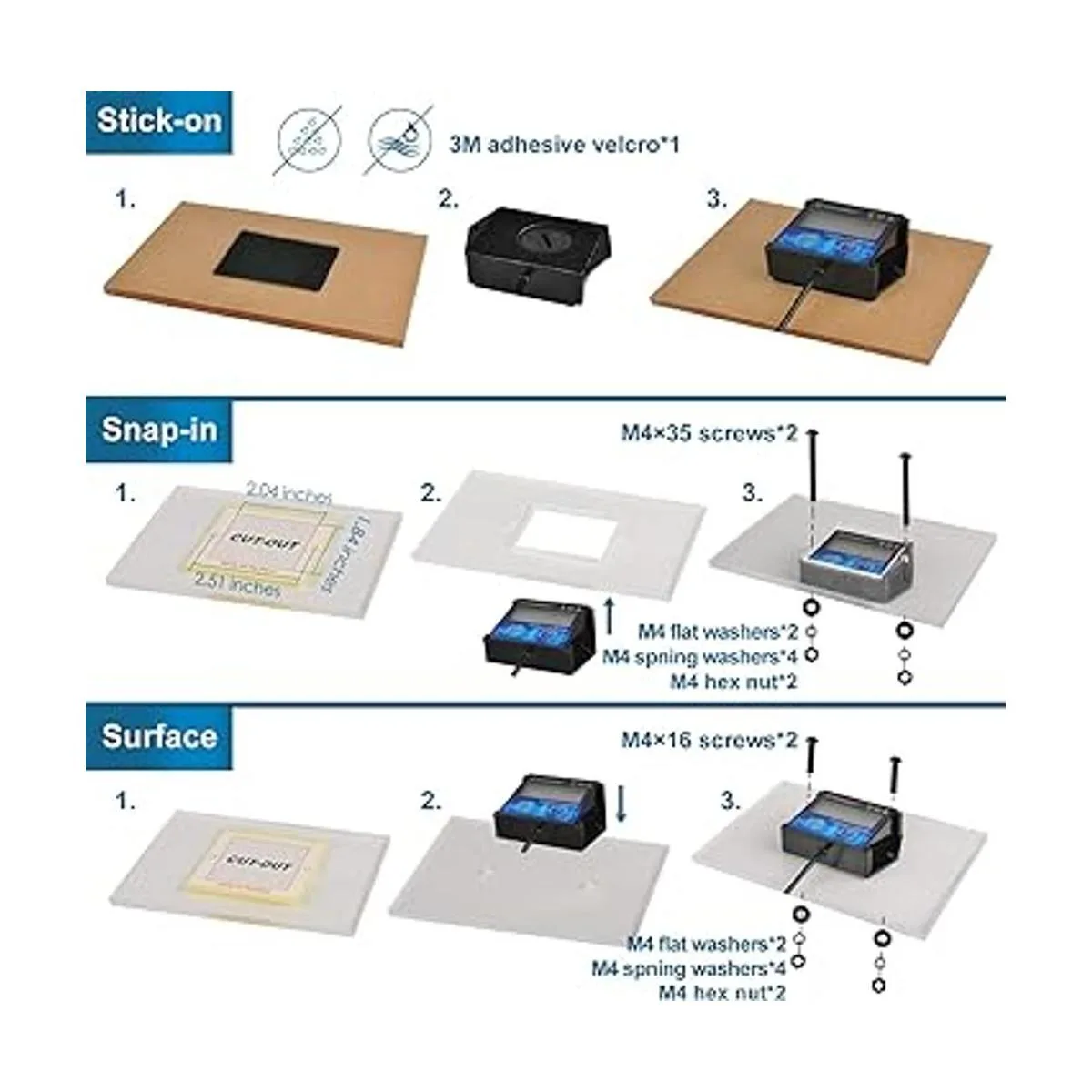 Instalación: se puede montar atornillando, pegando y encajando el tamaño del corte del panel: 2.1 x 1.9 in en cualquier posición adecuada, los accesorios bien competitivos lo mantendrán adecuado para diferentes requisitos de uso; un diseño de conexión de cable para detección de señal del motor con cable acortar o extender longitud del cable: aproximadamente 66.9 in.