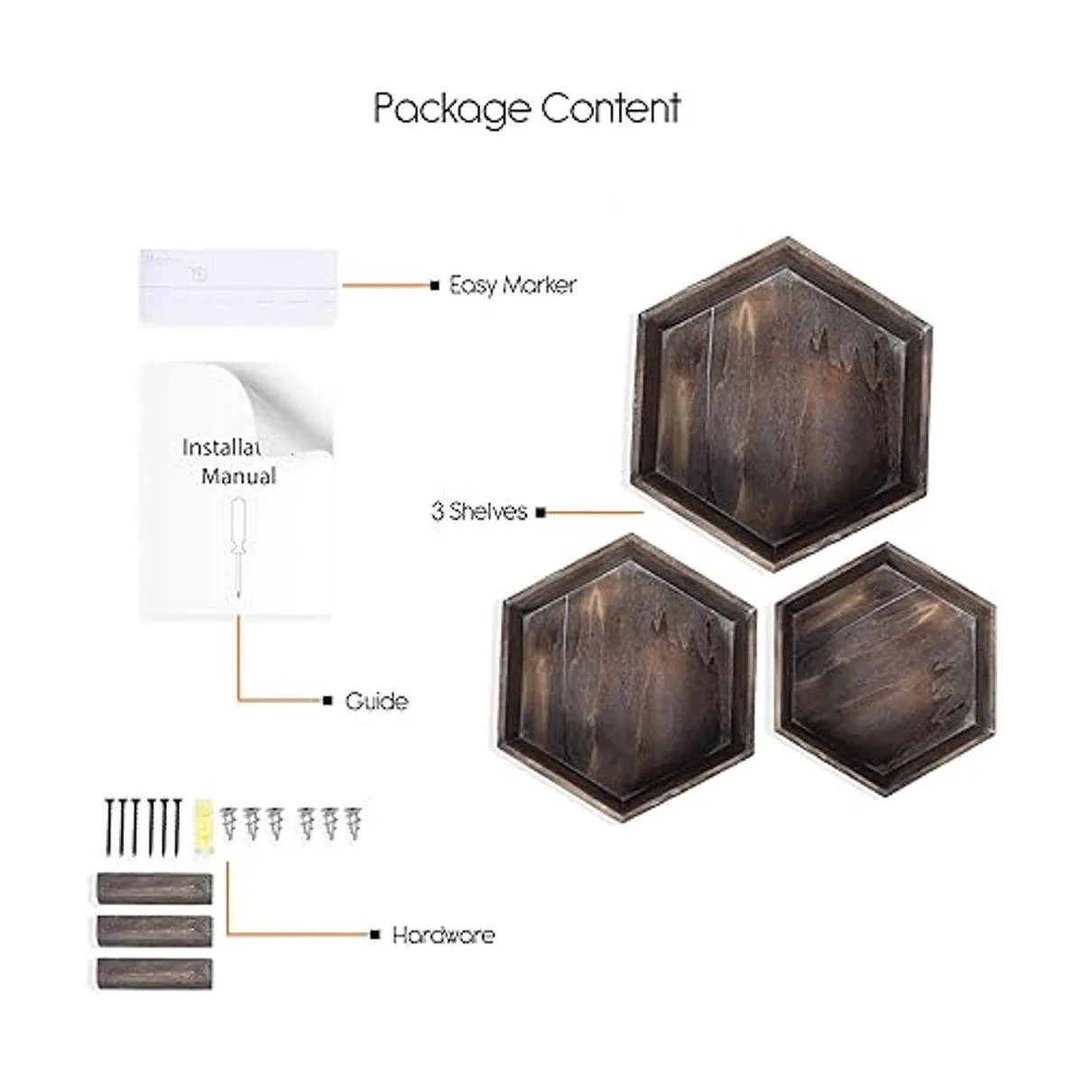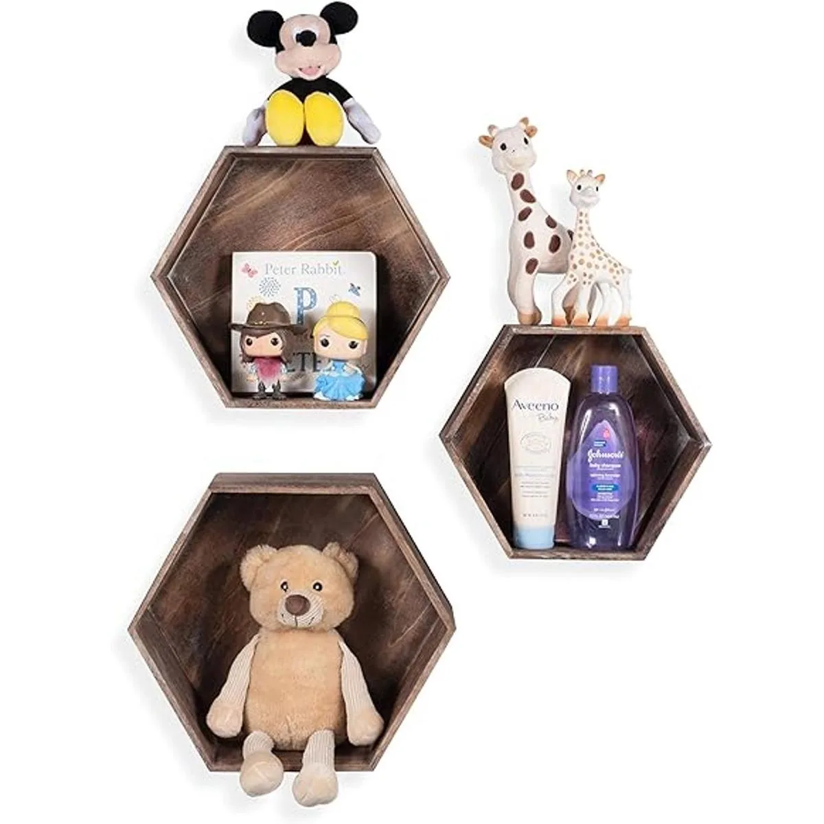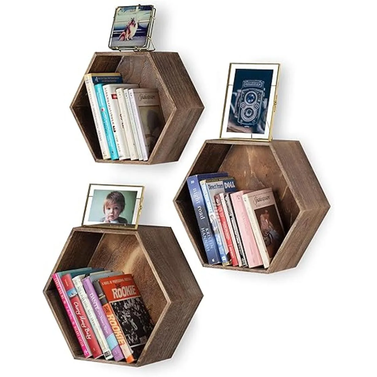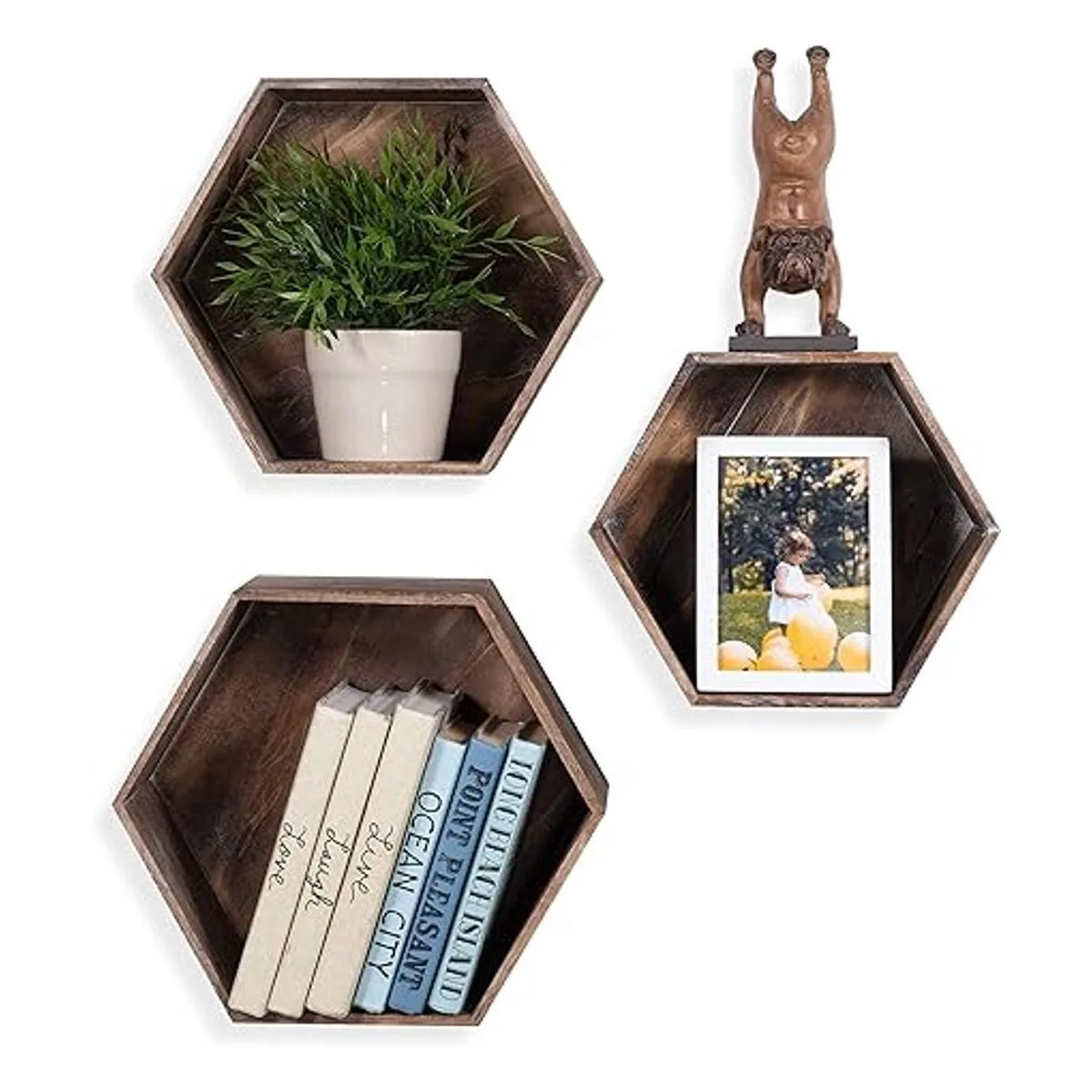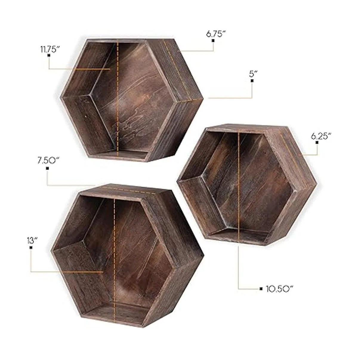 Rustic State Brooks Caja de madera hexagonal con diseño de panal de abeja para pared, diseño geométrico flotante, estantería colgante para libros, con respaldo de madera, nogal envejecido, varios tamaños, juego de 3
