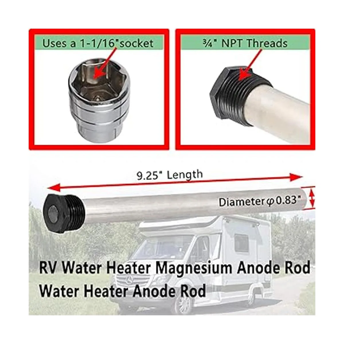 Para calentadores de agua RV y calentador de agua de caravana. Pieza de repuesto Suburban 232767 y MorFlo varilla de ánodo para calentador de agua de 6 galones. Rollo grande de cinta de sellado de rosca de teflón y llave de elemento hexagonal de 1 1/2 pulgadas incluido para ti. Tamaño: 9 pulgadas de longitud y tiene rosca NPT de pulgadas. Utiliza un enchufe de 1 1/16 pulgadas.