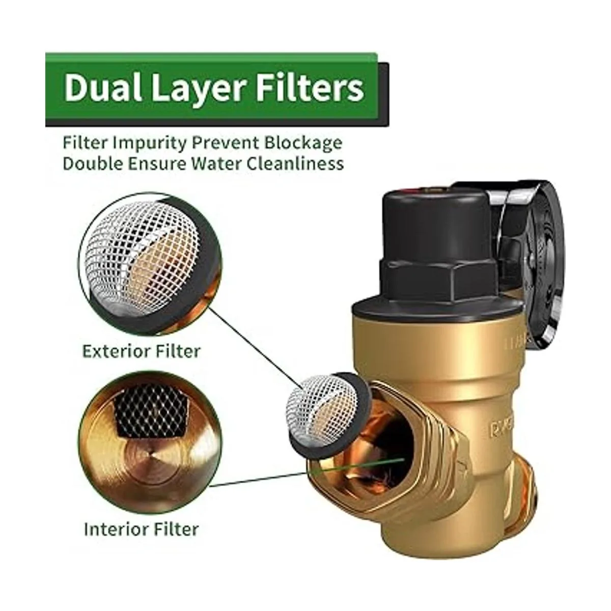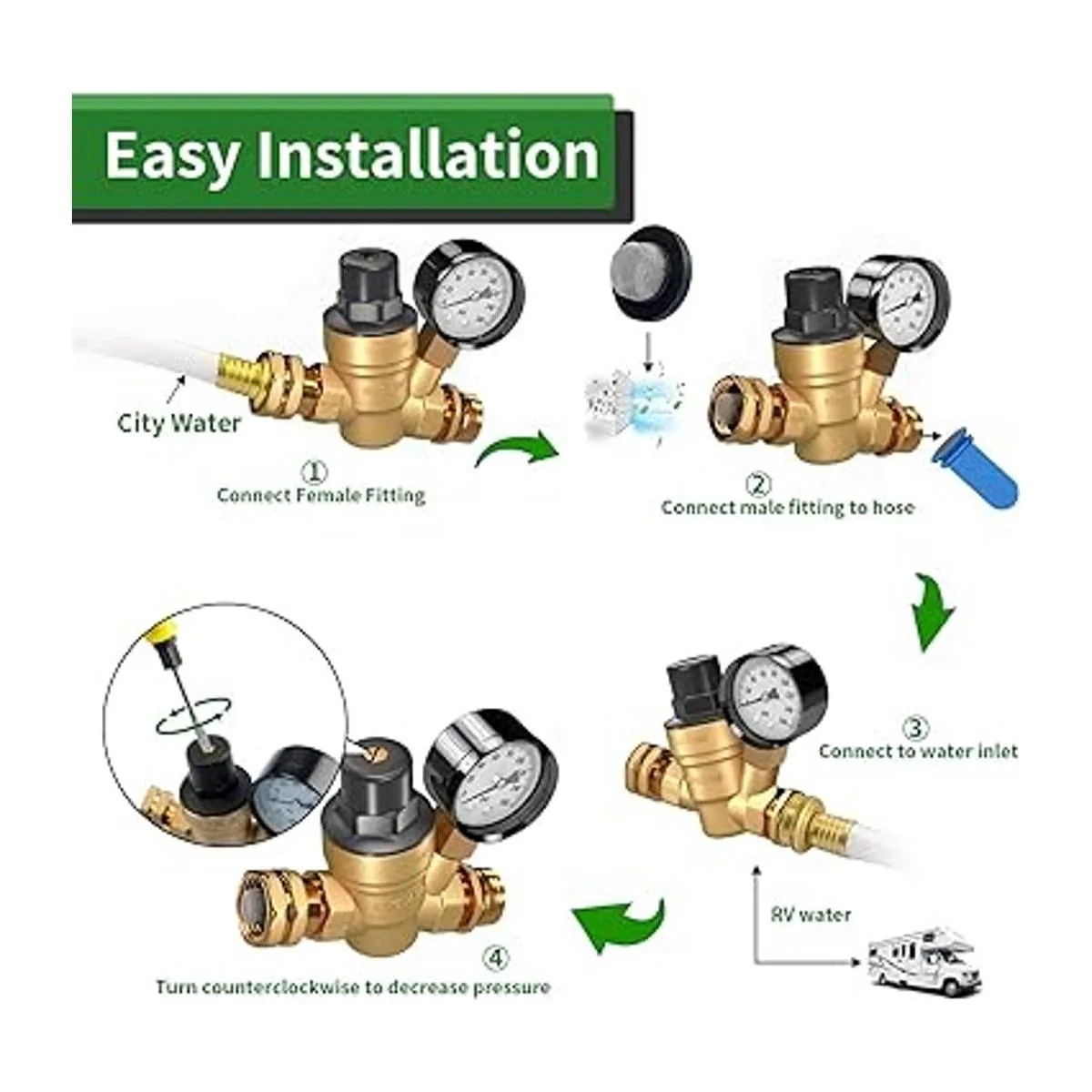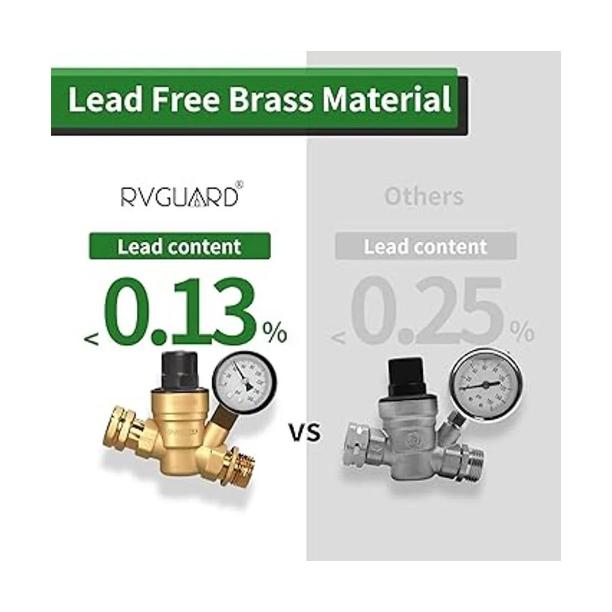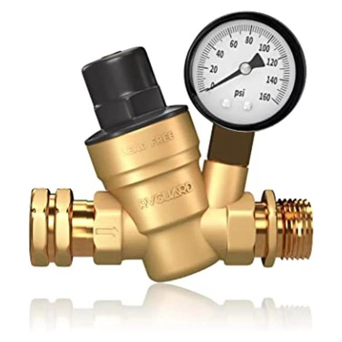 RVGUARD Válvula reguladora de presión de agua para RV, reductor de presión de agua ajustable sin plomo de latón con medidor y filtro de pantalla de entrada para caravanas y remolques de viaje