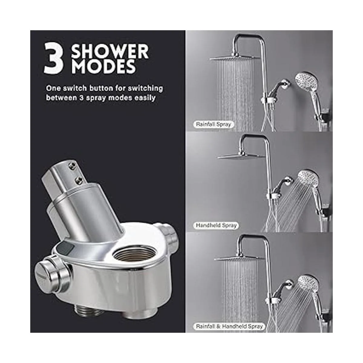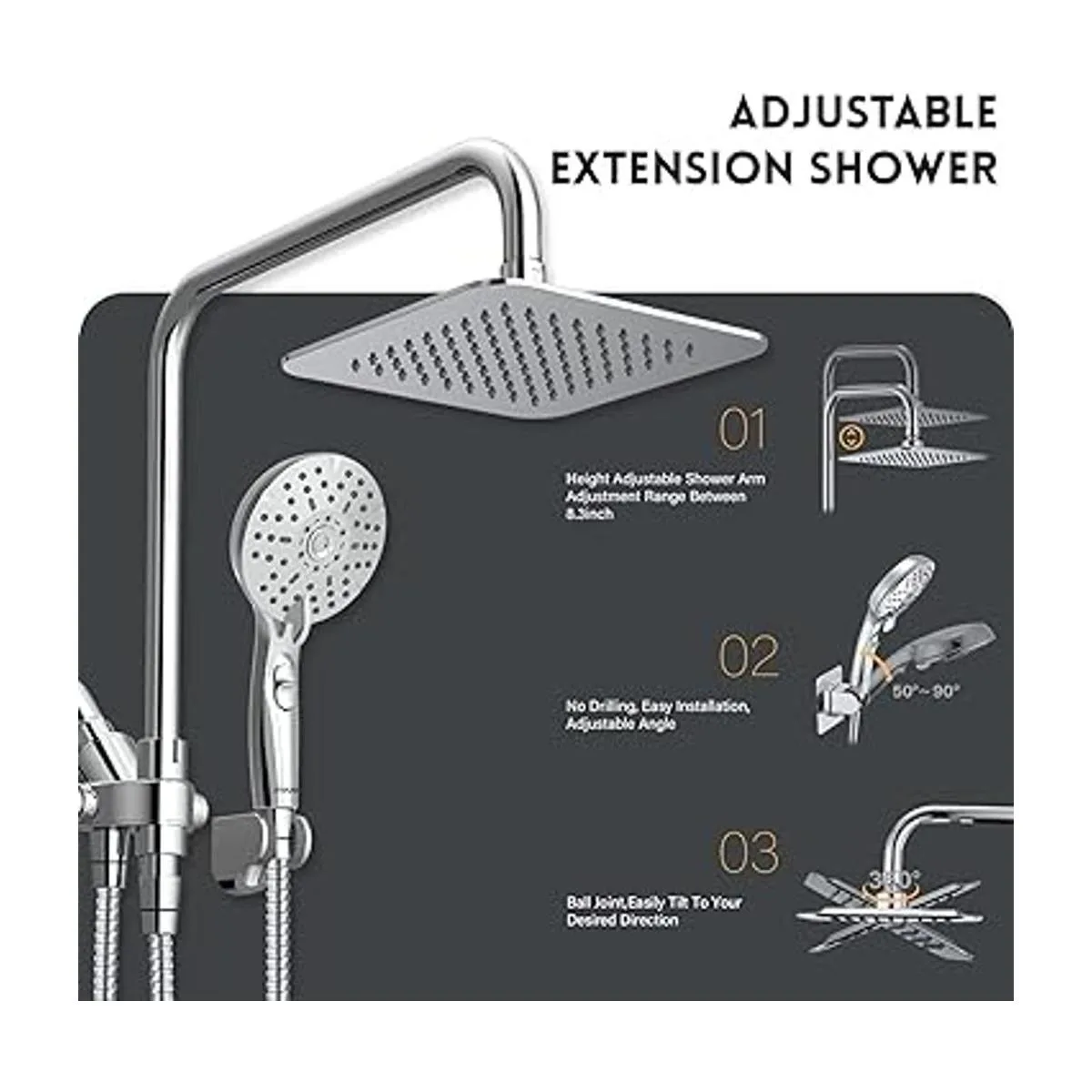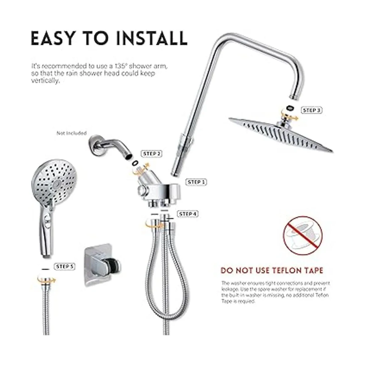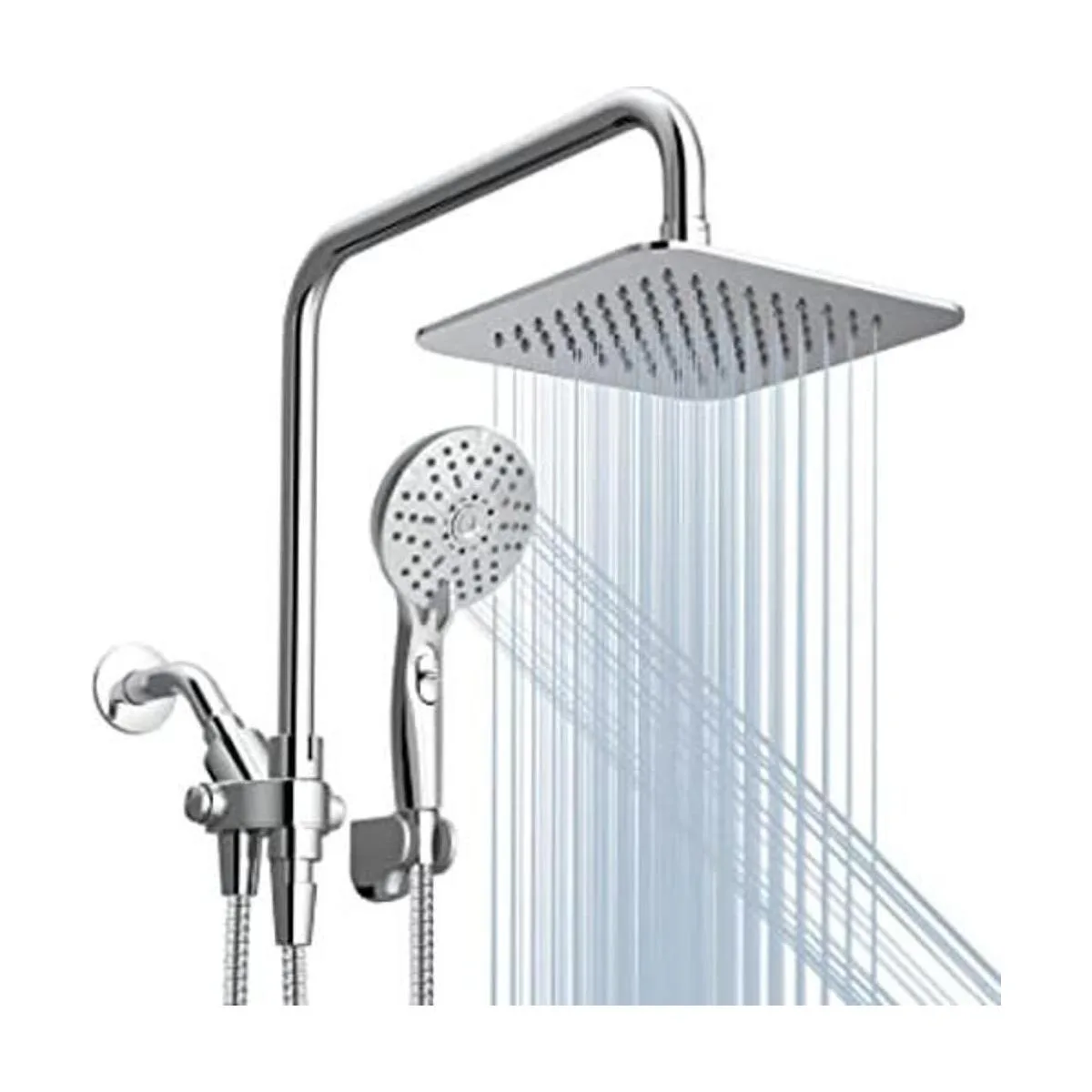Cabezal de ducha doble: el cabezal de ducha cuadrado de 8 pulgadas y la ducha de mano de 4.5 pulgadas están hechos de ABS, muy duradero. Recibirás: cabezal de ducha de lluvia de 8 pulgadas, ducha de mano, desviador de 3 vías, columna de ducha en forma de L, soporte de ducha de mano, 2 mangueras, 2 limitadores de flujo de 1.75 GPM, 2 arandelas de repuesto, filtro de agua, destornillador hexagonal pequeño, manual de instrucciones idioma español no garantizado. No incluye brazo de ducha en el embalaje.