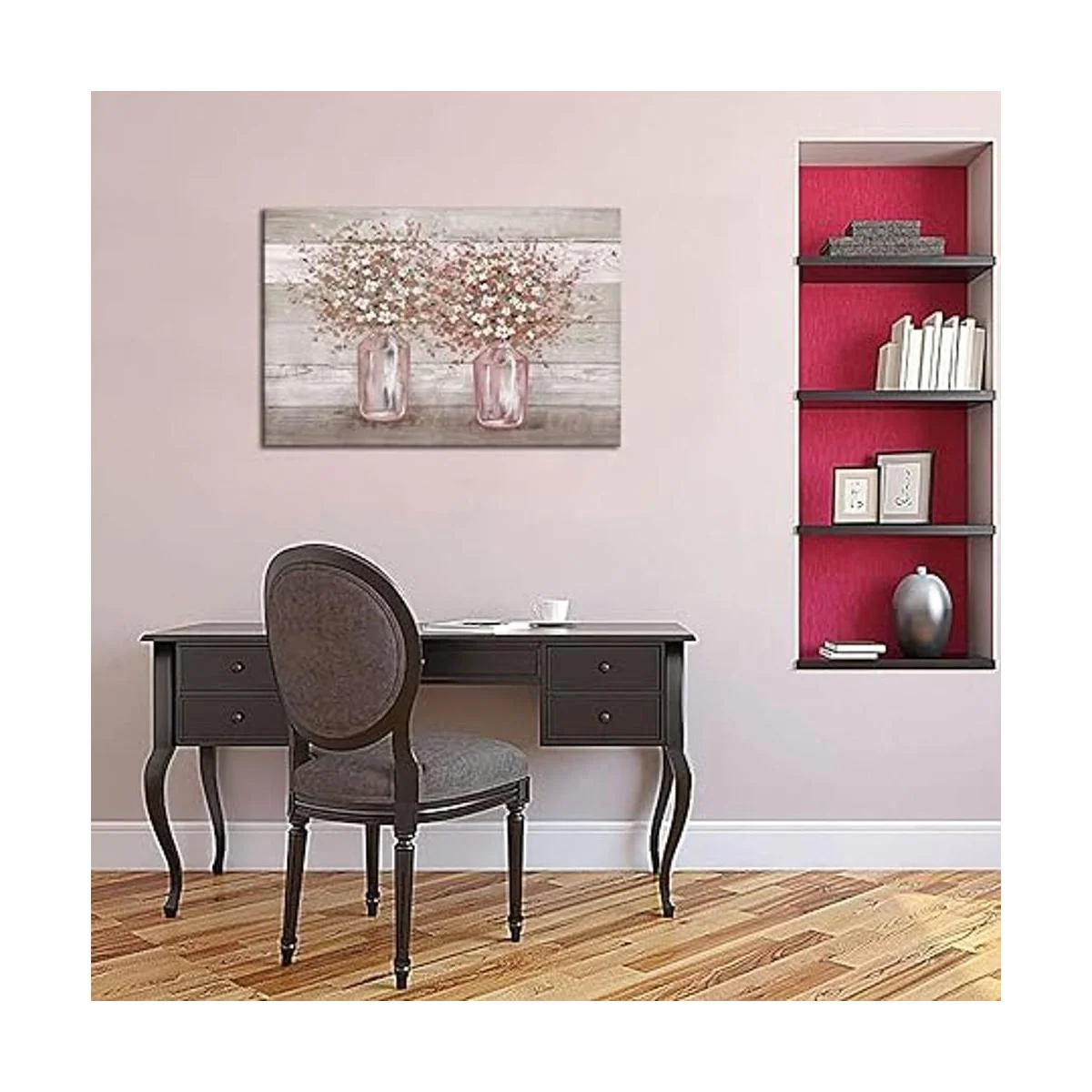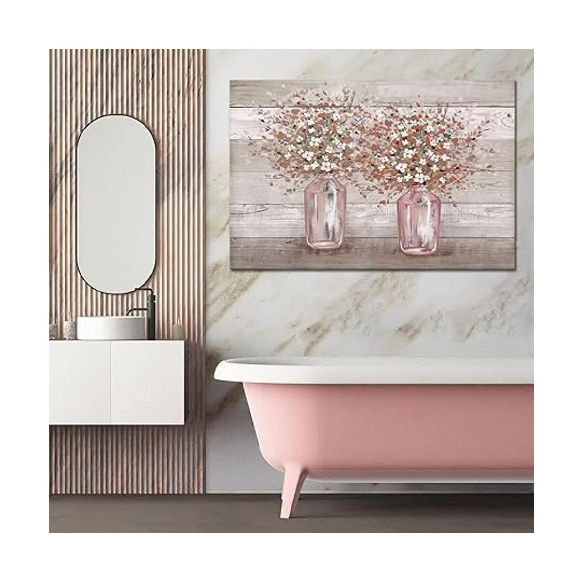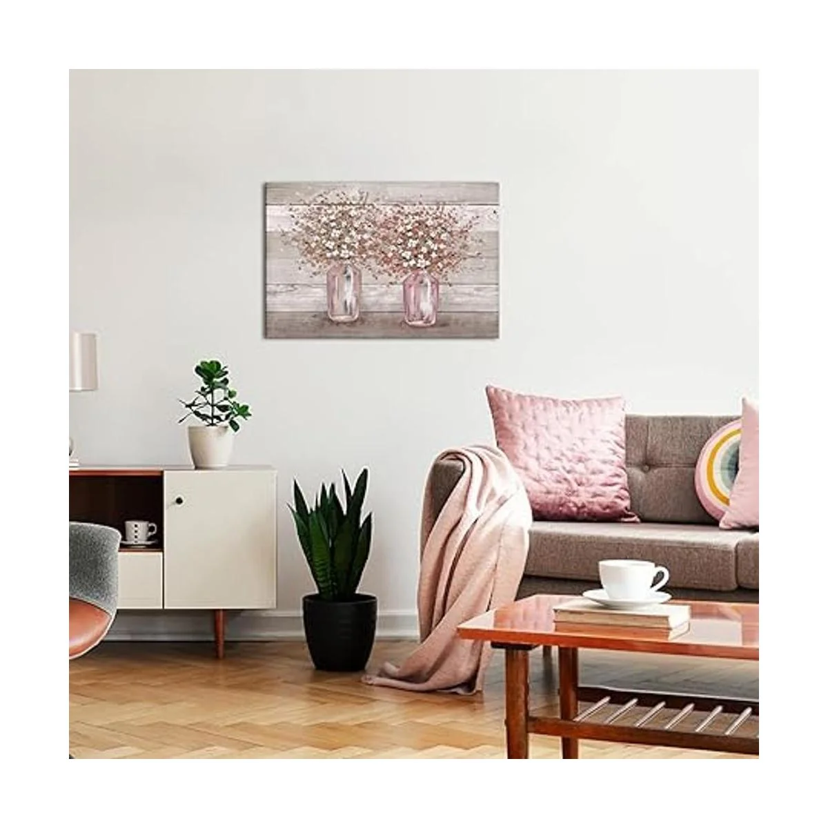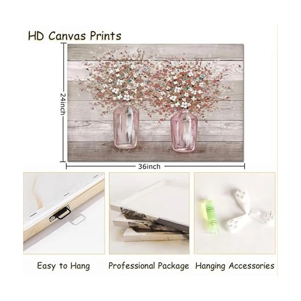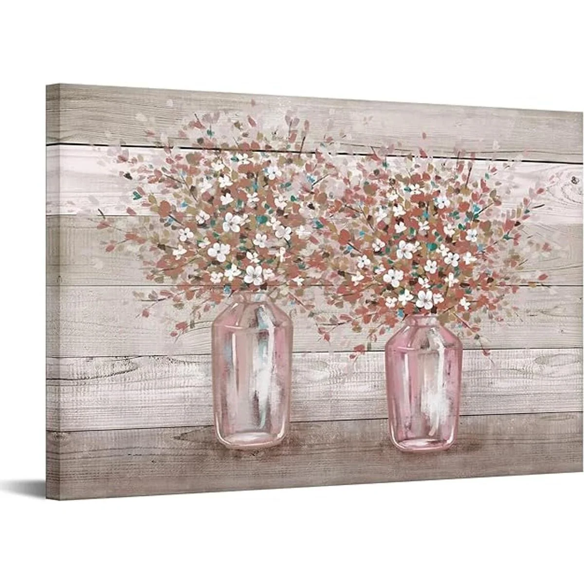 RyounoArt Lienzo de granja para pared para sala de estar, ramo floral abstracto en tarro rosa, decoración de pared, impresiones rústicas de pintura de flores enmarcadas, listas para colgar, 24 x 36 pulgadas