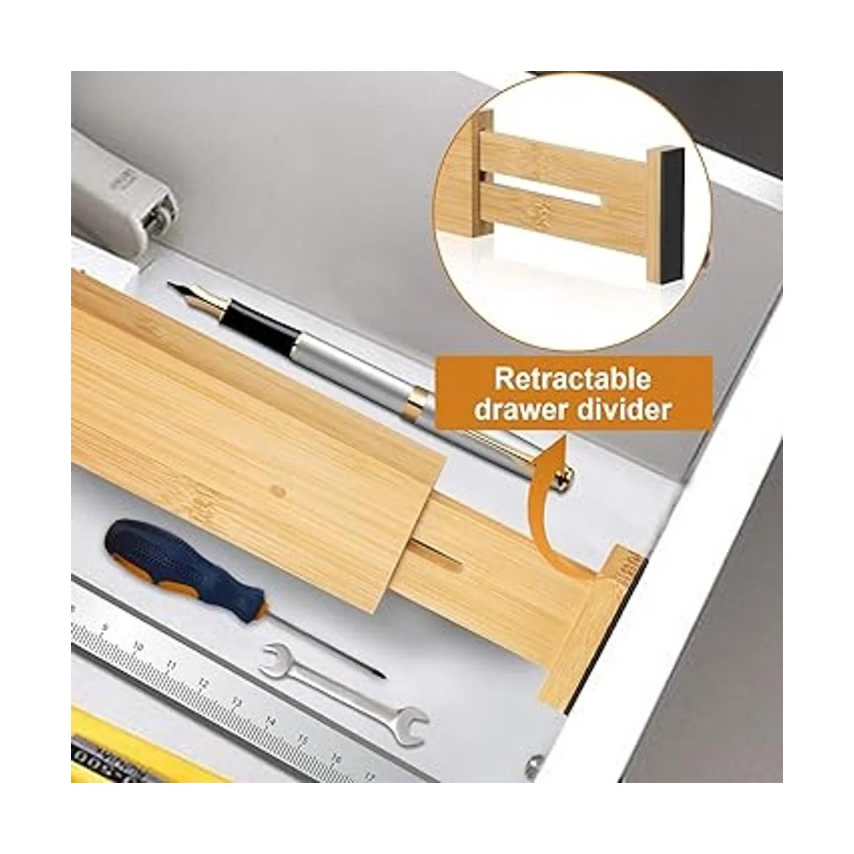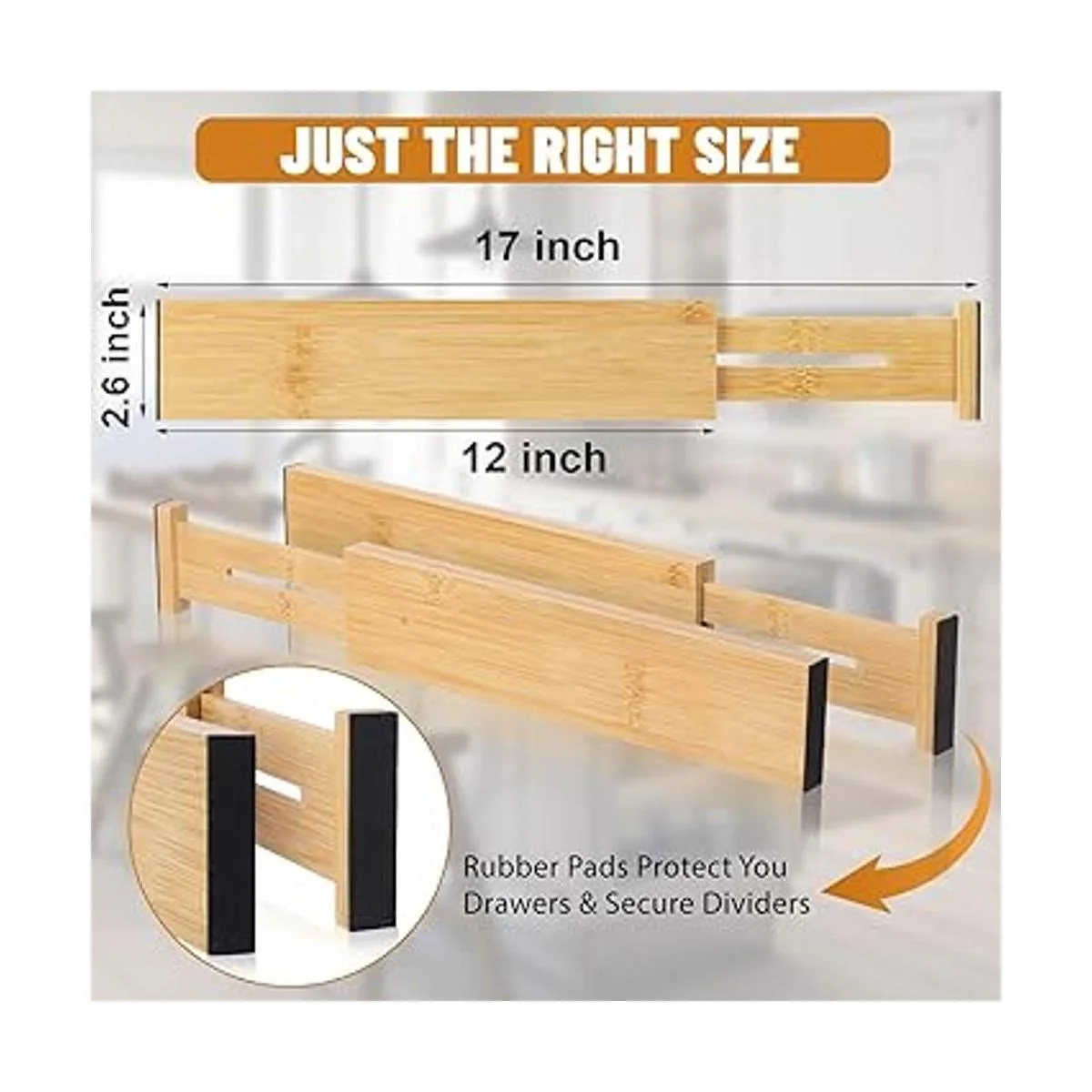 Materiales de alta calidad: los organizadores de cajones Ryqtop están hechos de bambú de alta calidad. Ambos extremos de los separadores de cajones de bambú están recubiertos con almohadillas de goma para proteger tu cajón y la propia caja de almacenamiento.