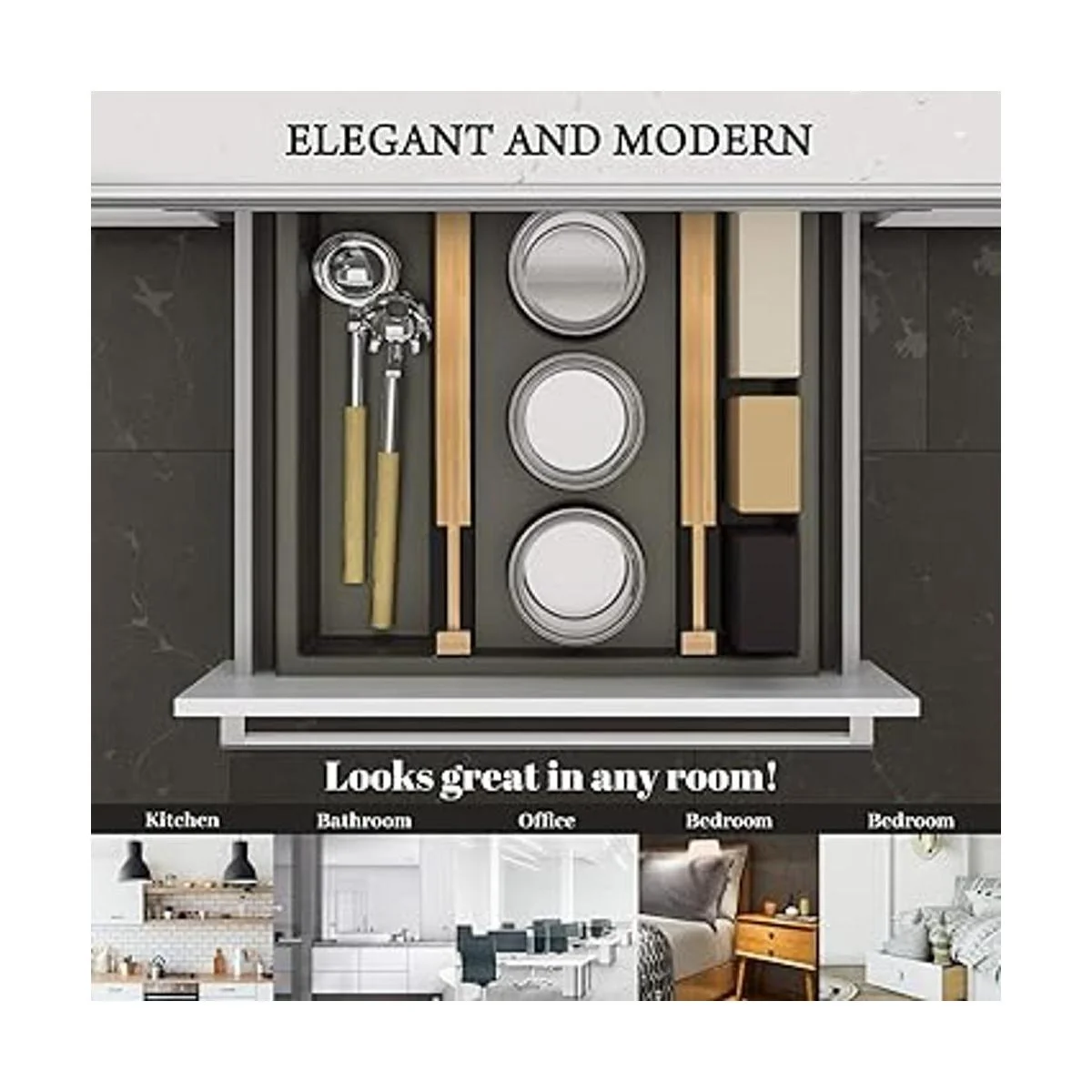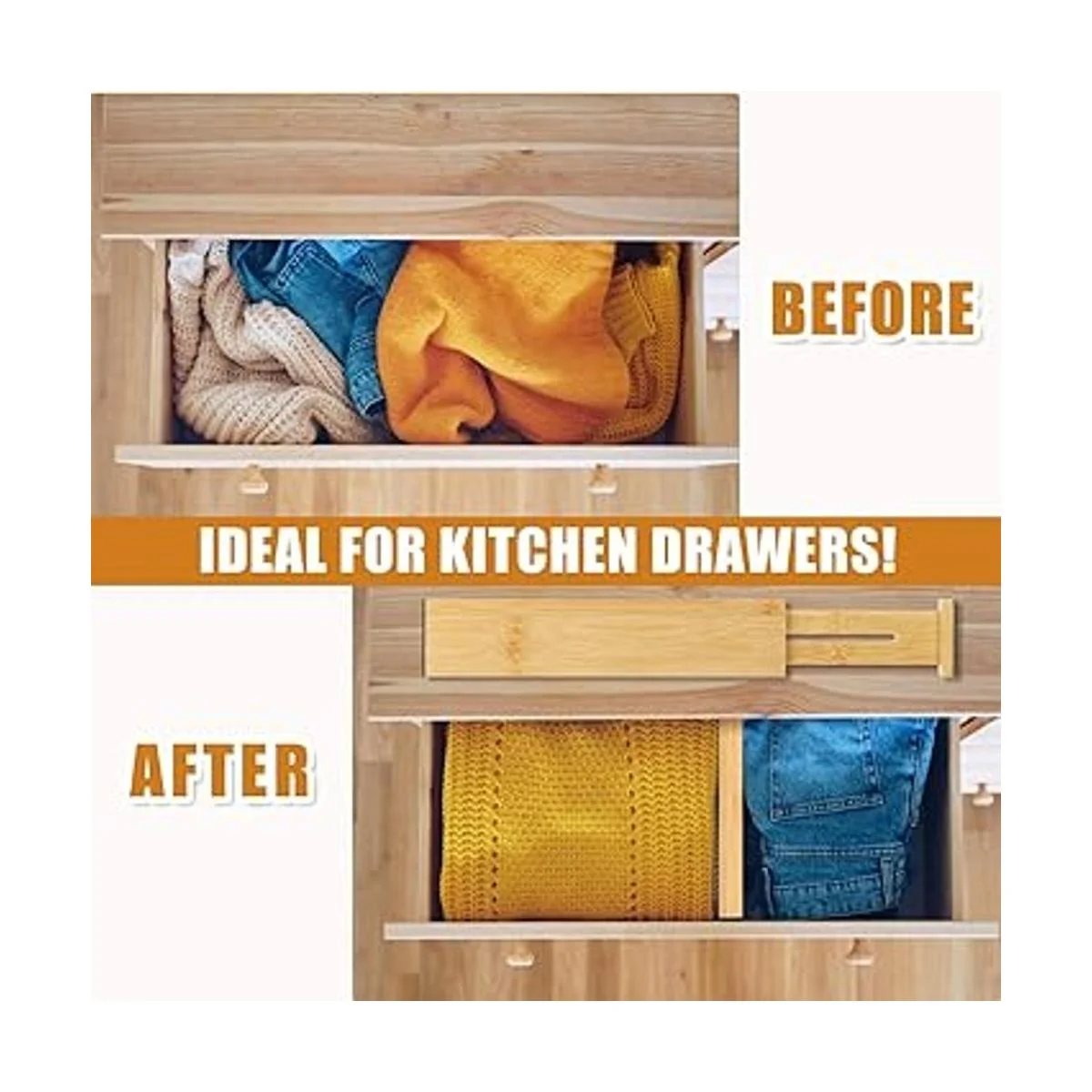 Multiusos: El organizador de cajones de cocina para utensilios grandes se puede instalar en cajones de cualquier tamaño. El organizador con cajones puede almacenar accesorios, ropa, platos, vajilla, alimentos y otros artículos en los cajones de la cocina, oficina, tocador. Solución perfecta para mantener todo en orden y hacer que tu hogar se vea ordenado.