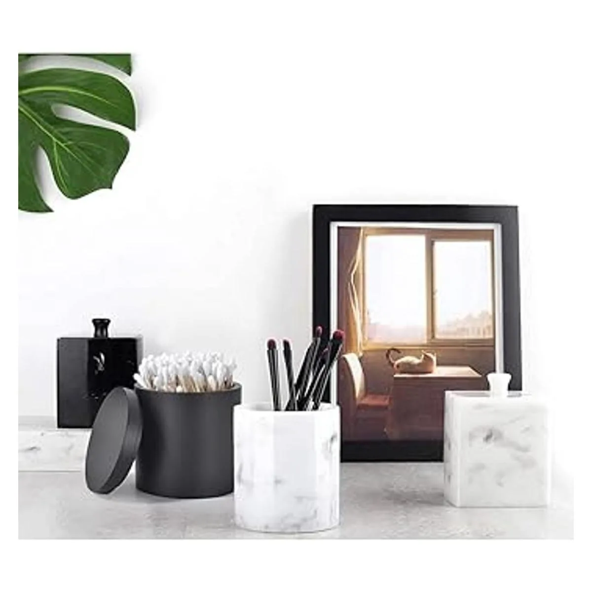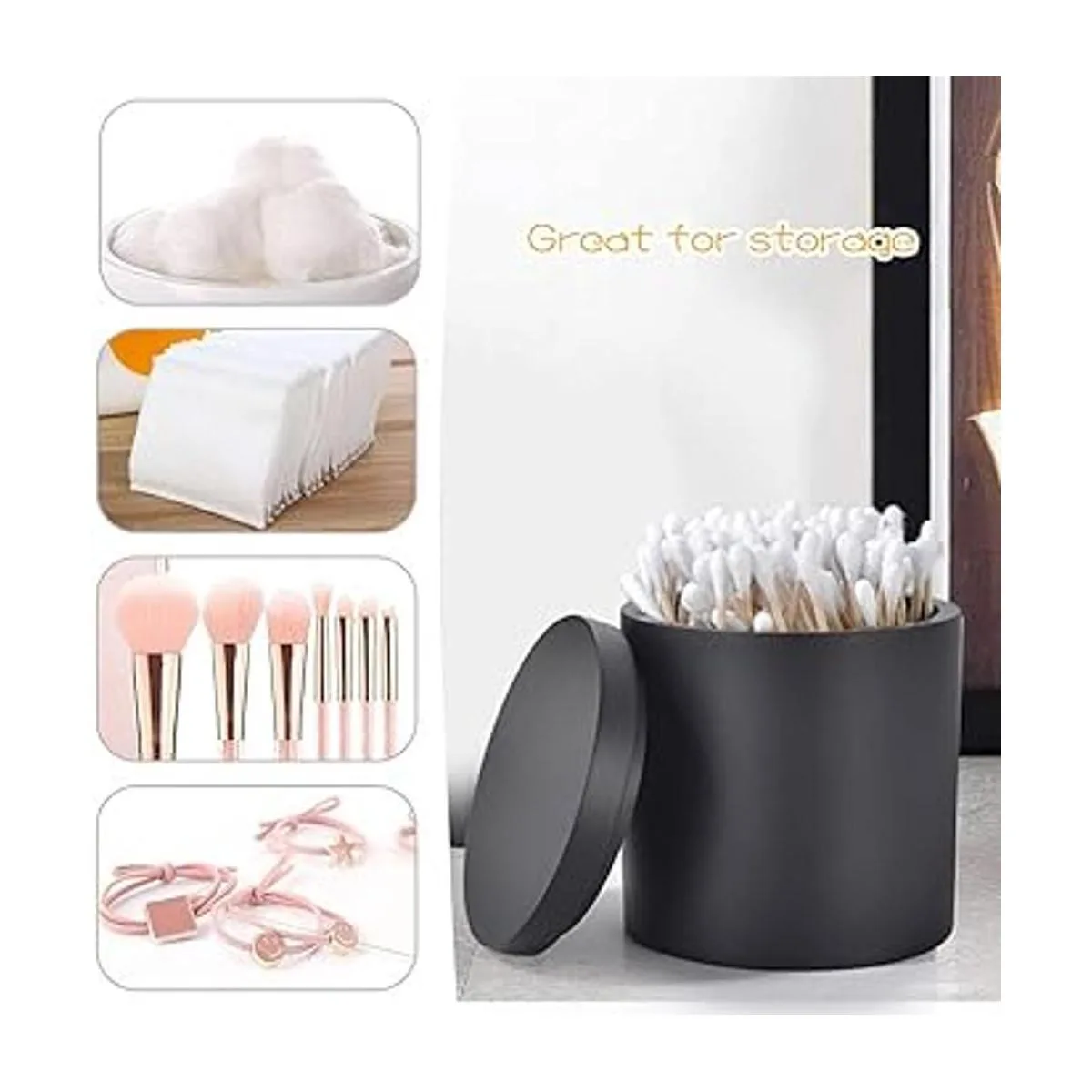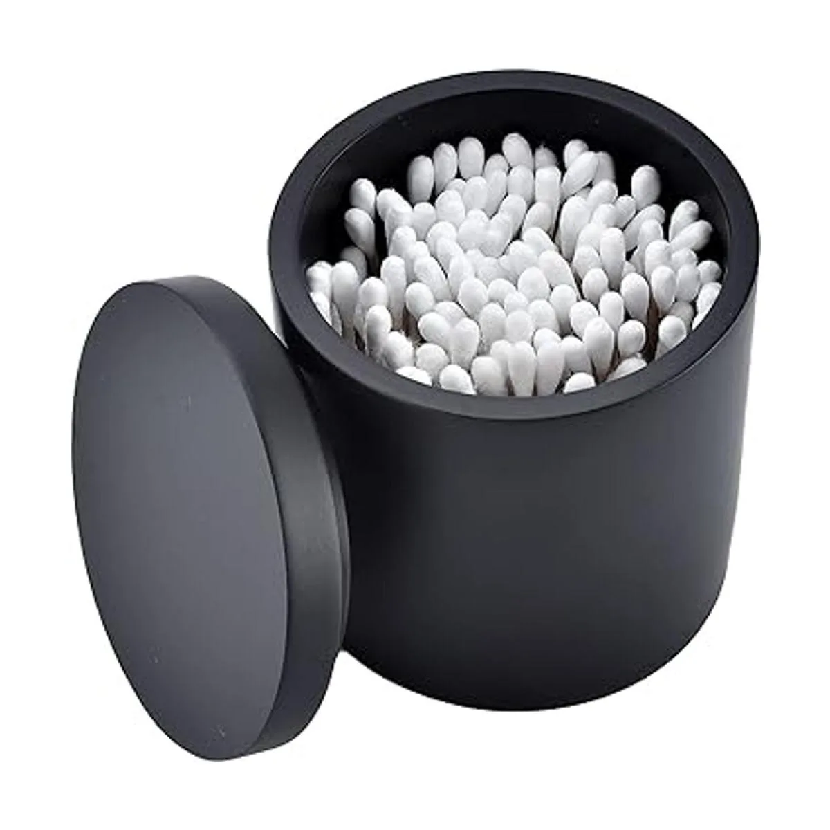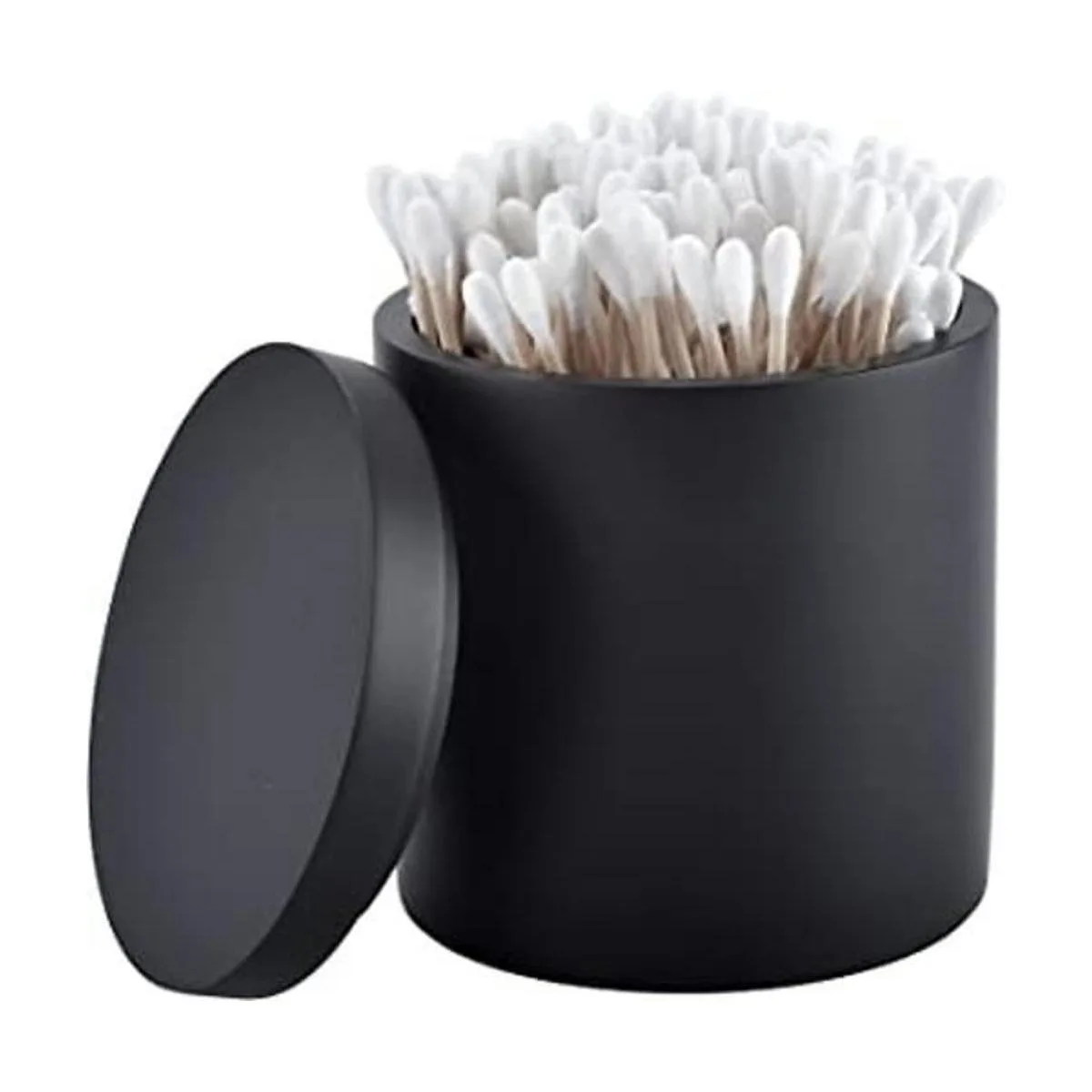 Rzoeox Soporte para hisopos de algodón con tapa, soporte Qtip para baño negro, bote de bolas de algodón de resina, tarro de cosméticos para encimera de maquillaje, contenedor organizador de recipientes para boticario