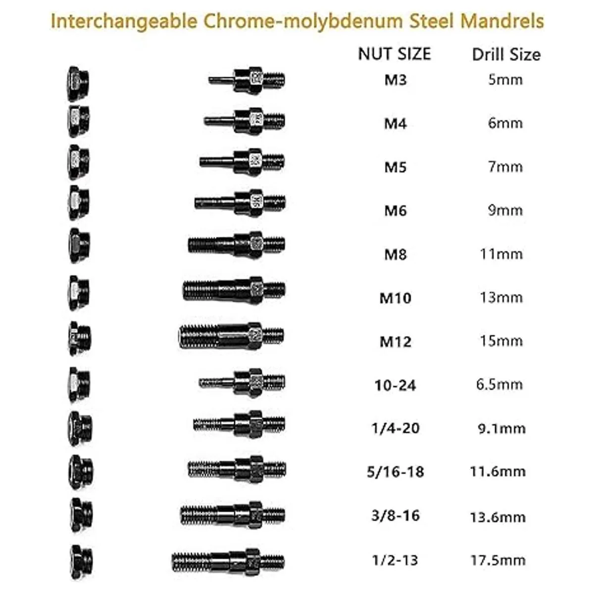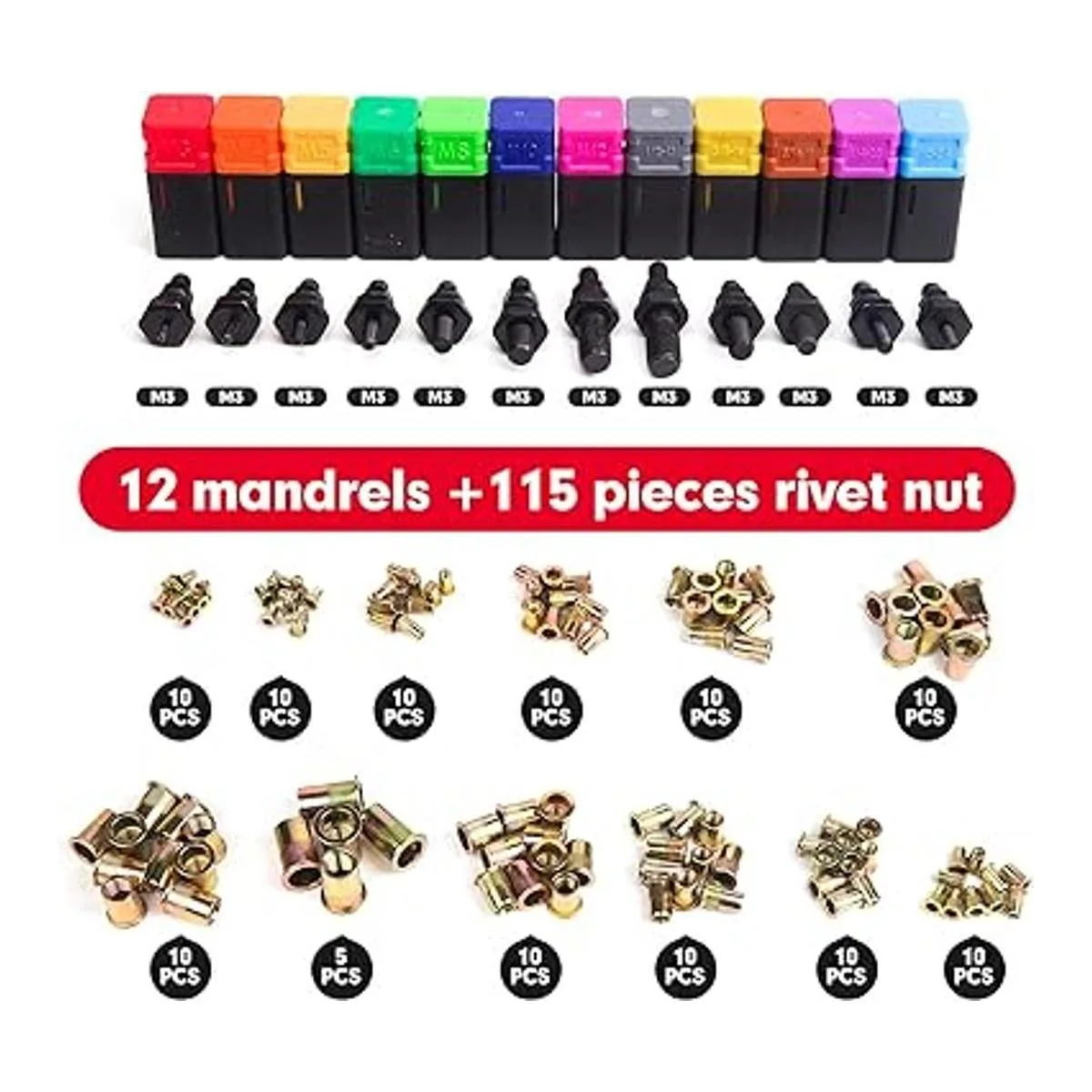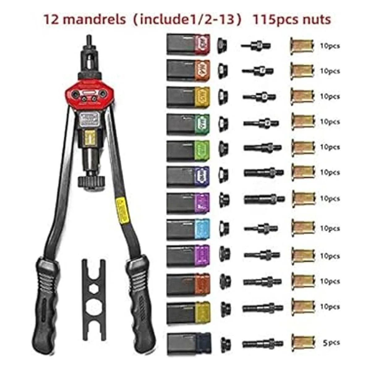 Accesorios completos: equipado con 12 mandriles intercambiables métrica M3 M4 M5 M6 M8 M10 M12; SAE 1024, 1/420, 5/1618, 3/816,1/213 y 115 tuercas de remache.