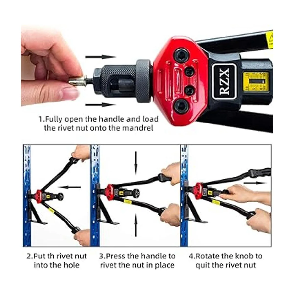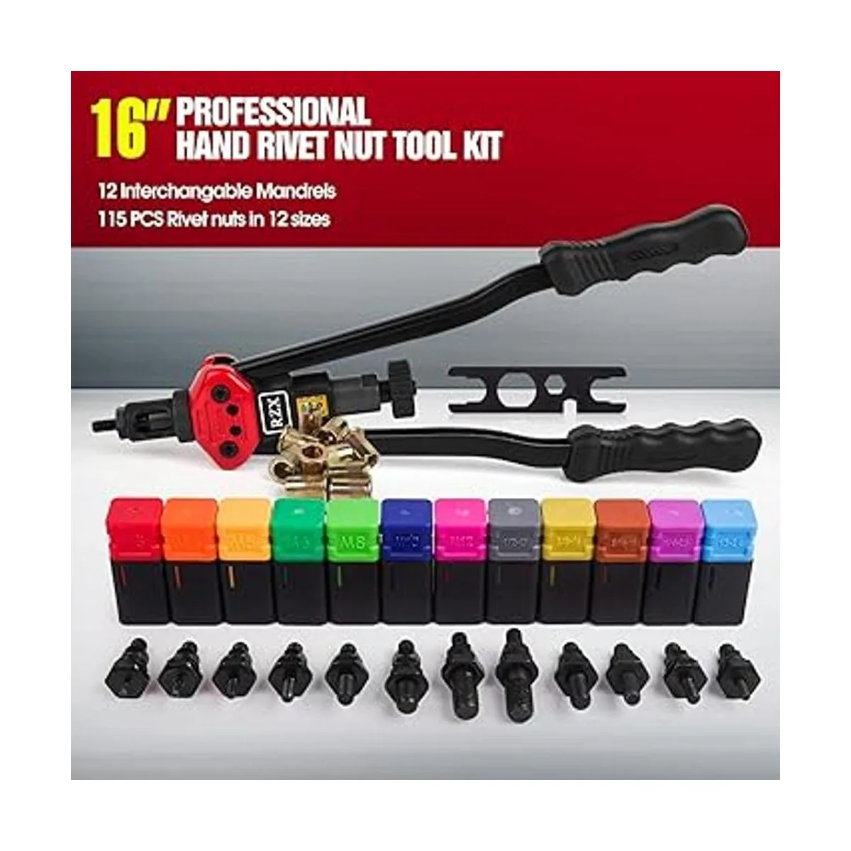 RZX Remachadora de tuerca de 16 pulgadas con sistema de ajuste de tuerca totalmente 12 mandriles M3 M4 M5, M6, M8, M10 M12, 1024, 1420, 51618, 3816, 1213 115 tuercas de remaches
