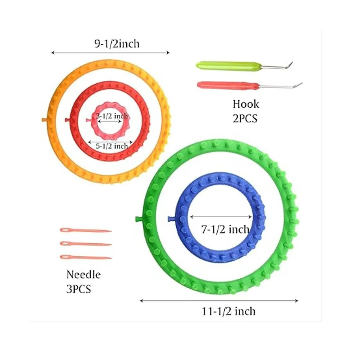 1. El juego de telares redondos incluye 5 tamaños de telares telar de 31/2 pulgadas; telar de 51/2 pulgadas; telar de 71/2 pulgadas; telar de 91/2 pulgadas; telar de 111/2 pulgadas, 2 agujas de hilo, 2 ganchos de ganchillo, 1 instrucciones básicas.
