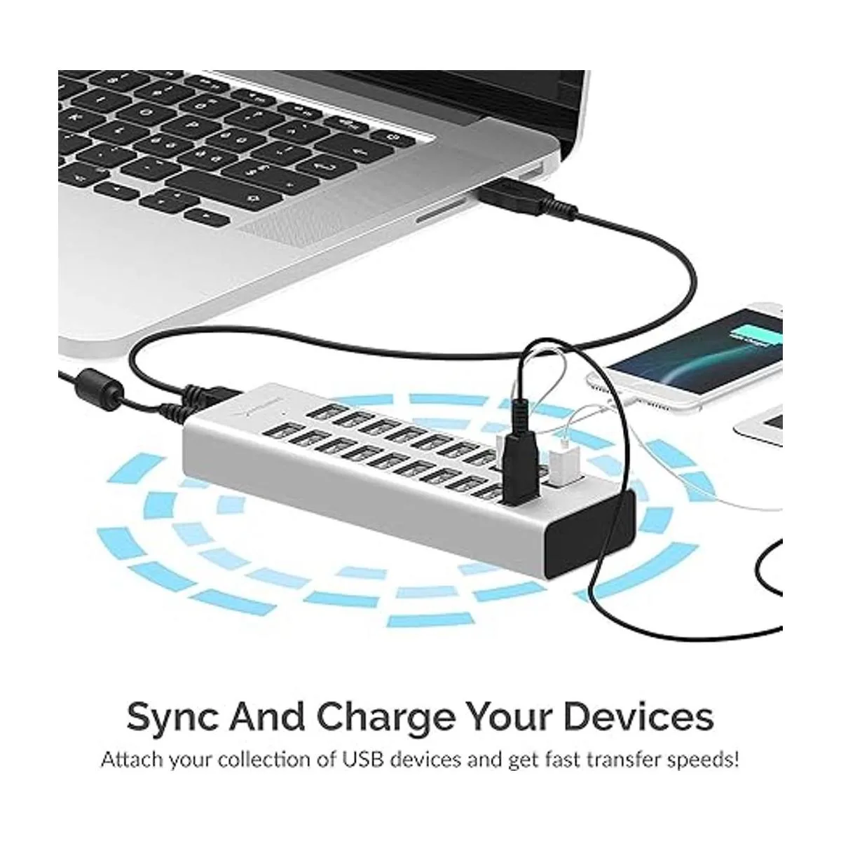 Conéctalo a cualquier toma de pared y carga hasta 20 dispositivos USB simultáneamente