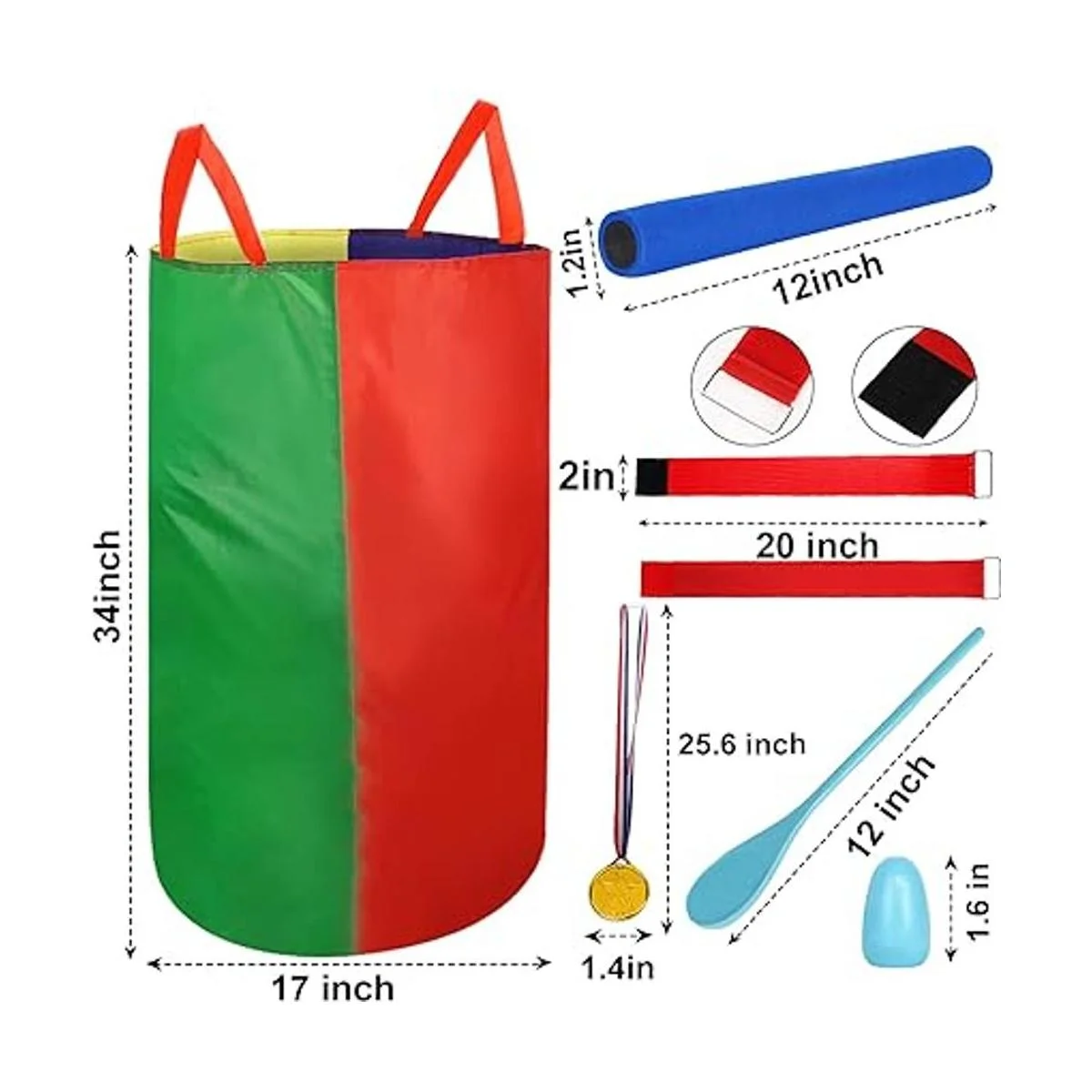 Juego de juegos al aire libre de 32 piezas: juegos de patio trasero para adultos y niños. 4 bolsas de carreras de saco de patatas apto para adultos y niños, 4 juegos de carreras de huevos y cuchara, 4 bandas de carreras de 3 patas, 4 bastones de relé de colores para carreras y 12 premios de juego recompensa a los niños que ganan los juegos. Adecuado para 4 a 8 jugadores para disfrutar de diversión sin fin con juegos de césped al aire libre.