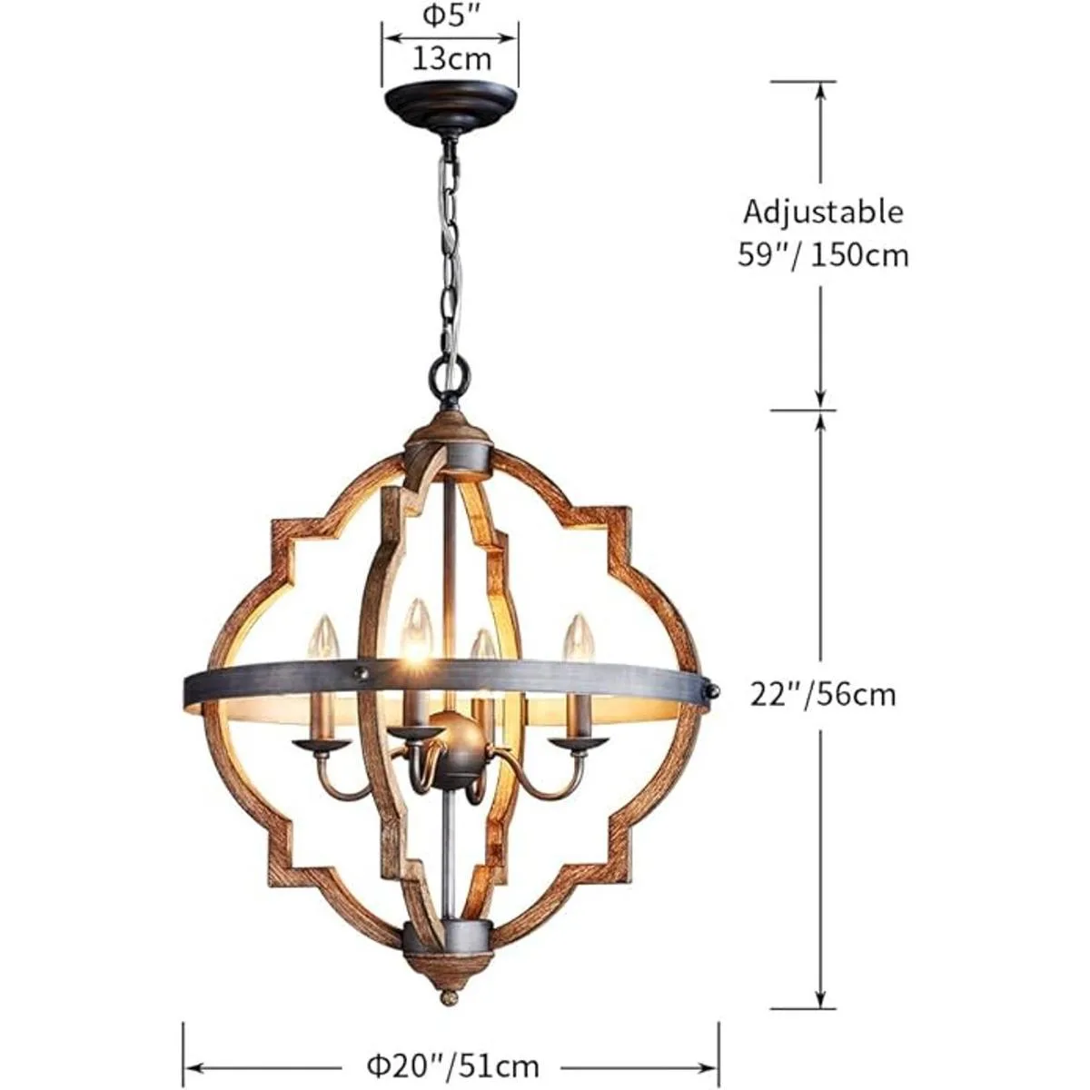 Fixture Dimension for this farmhouse chandelier: Height 22 inches x Diameter 20 inches, Chain/Cord Length: Max 60 inches, length adjustable, sloped ceiling adaptable.