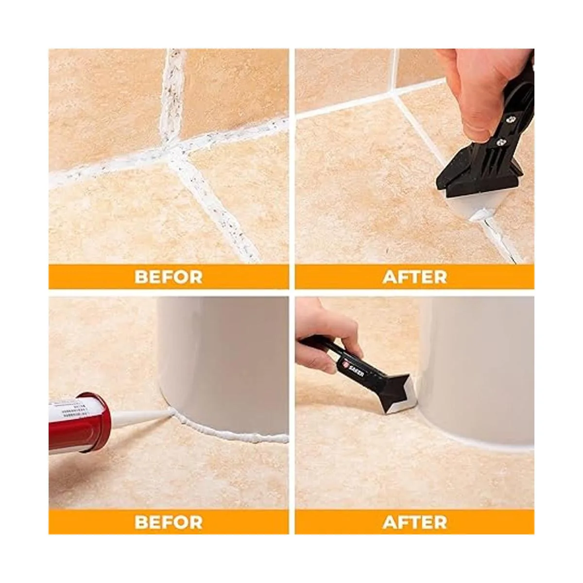 Saker Herramientas de calafateo de silicona, herramienta de acabado de sellador 3 en 1, removedor de lechada, raspador, raspador de ángulo de pegamento de vidrio para baño, cocina, piso, ventana, junta de fregadero, sello de marcos negro1