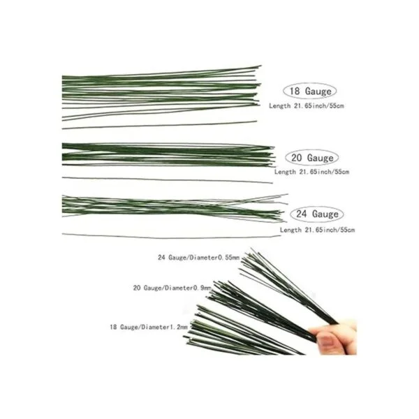 El paquete incluye: 20 piezas de calibre 18, 20 piezas de calibre 20 y 20 piezas de calibre 24, total 60 piezas de alambre floral verde oscuro en el paquete.