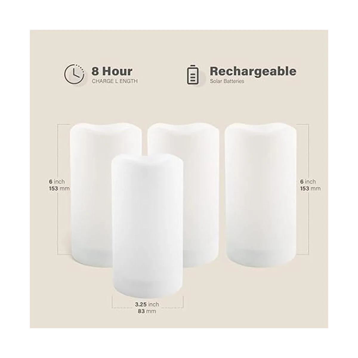 Brillo blanco cálido: cada vela para exteriores contiene un LED blanco cálido parpadeante para un efecto de iluminación realista. Temperatura de color: 2700 K. Dimensiones: 3,25 x 6.