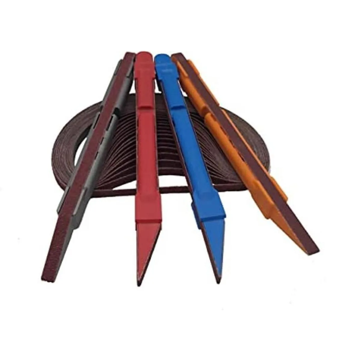 El kit estándar de 24 piezas incluye 4 palos codificados por colores y 5 cinturones cada uno en grano 80, 120, 180 y 240