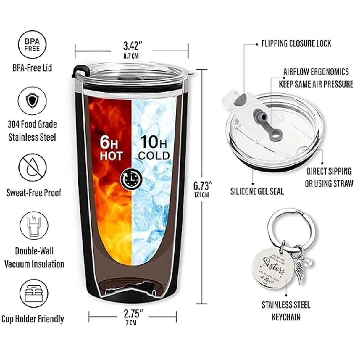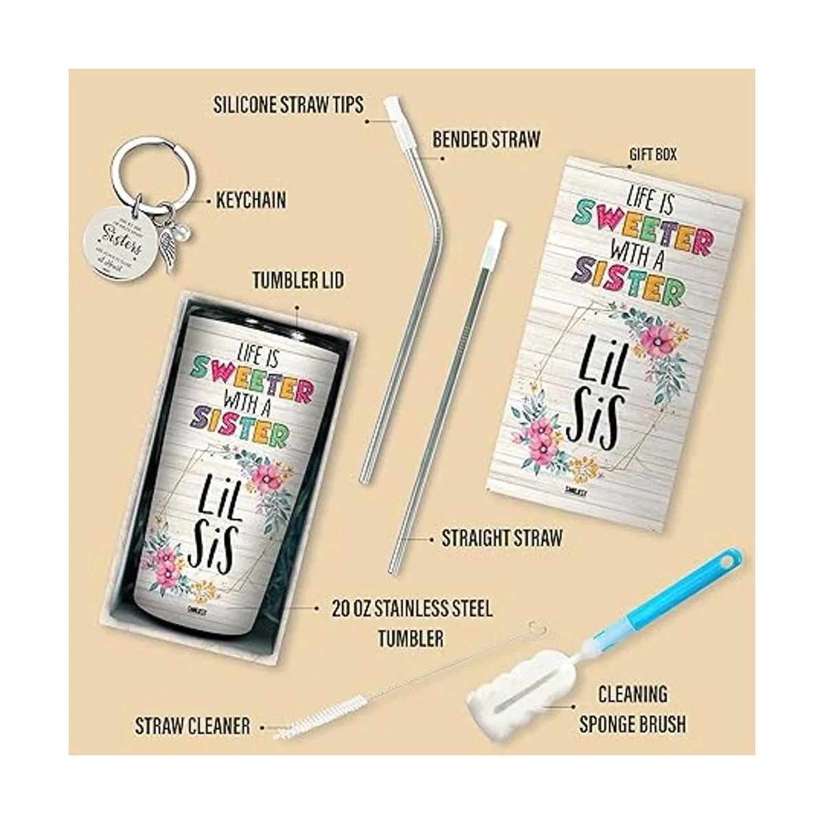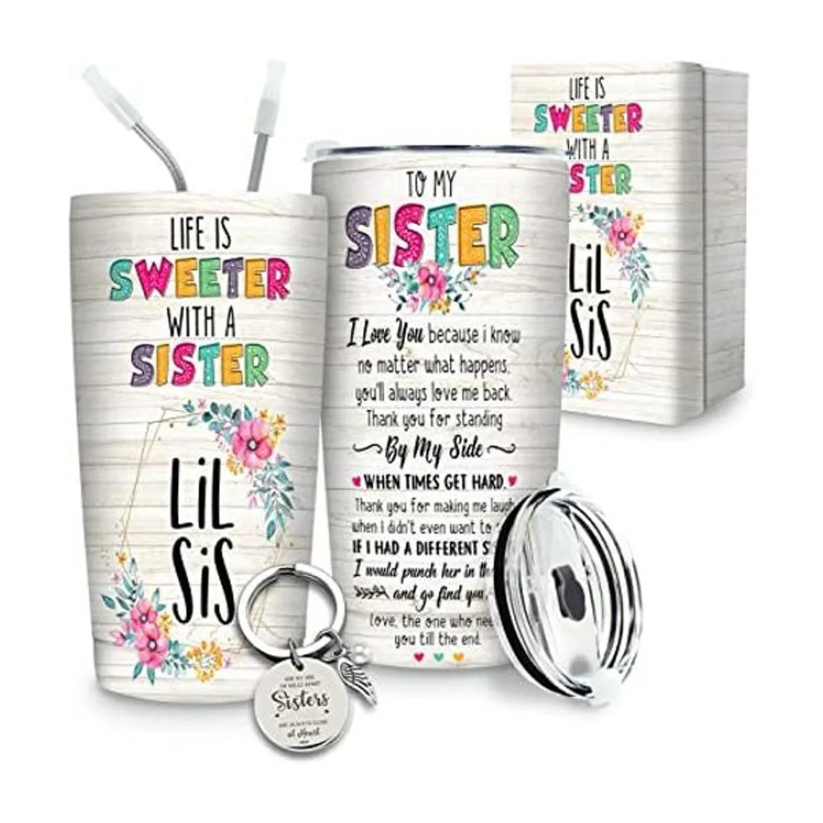 Paquete de caja de regalo: esta taza de hermana con una tapa, 2 pajitas 1 recto y 1 doblado y un llavero especial con cita significativa es un regalo increíble para hermanas que la hacen feliz absolutamente