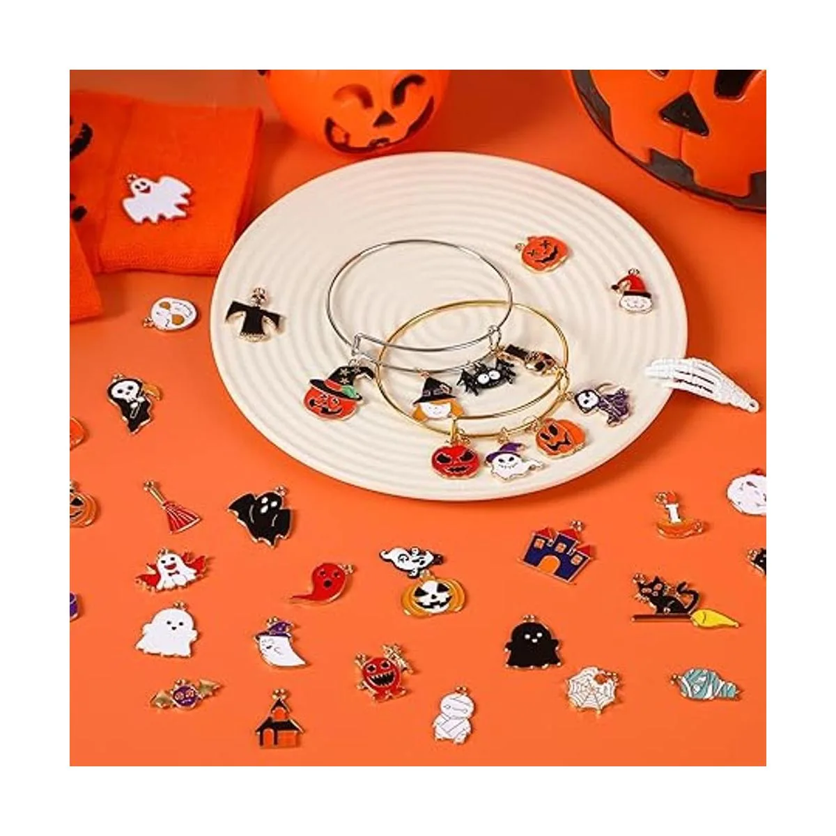 Material: hecho de gran aleación de zinc, que es duradero y no se decolora fácilmente. Los dijes de Halloween tienen material de buena calidad, color brillante, no se rayan fácilmente y se pueden reutilizar. Siempre y cuando mantengas los dijes de esmalte dorado cuidadosamente, será un hermoso abalorio sin importar cuando lo utilices.
