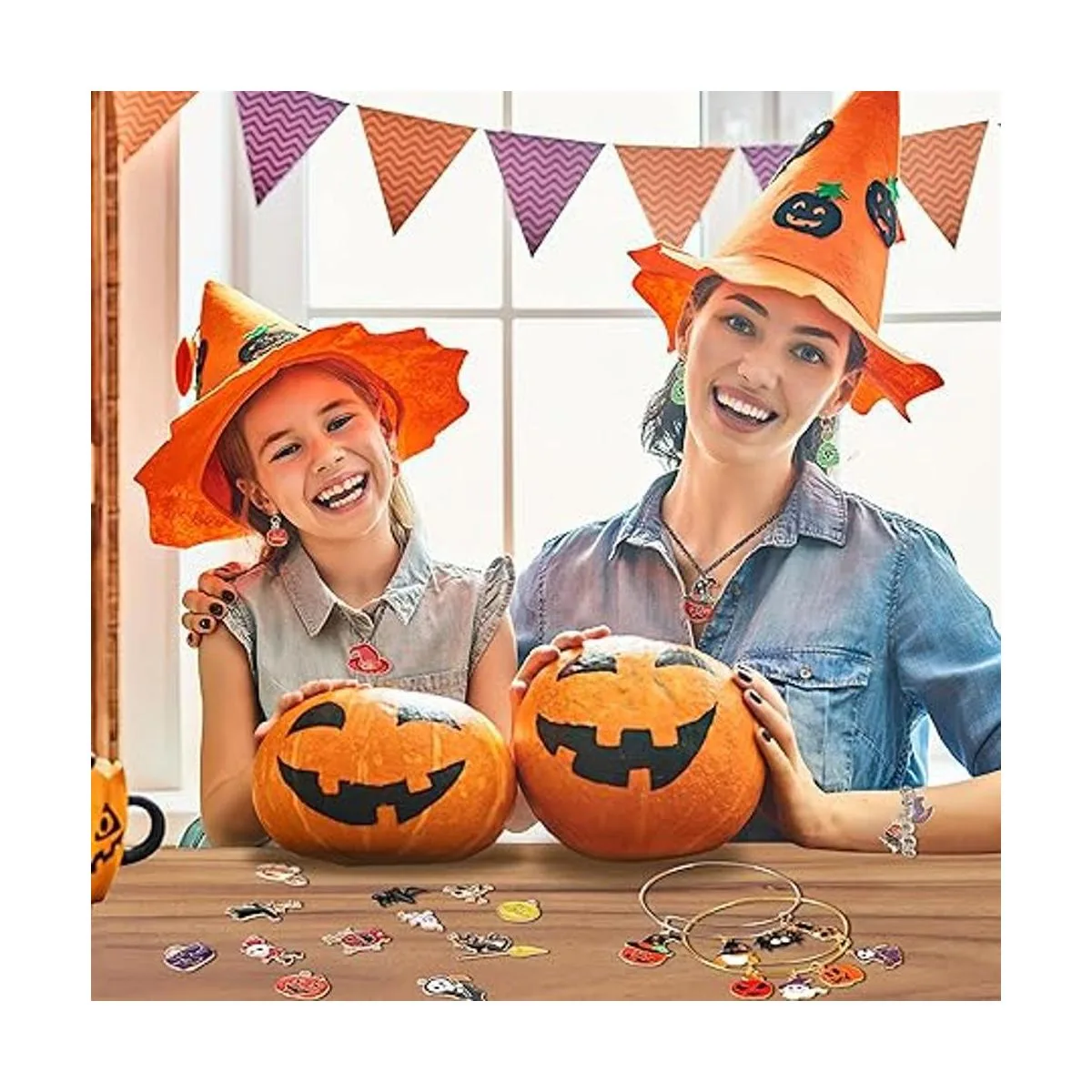 Diseño de patrón: diferentes diseños temáticos de Halloween, como calabazas, fantasmas, brujas, murciélagos, esqueleto, gato, sombrero de mago, etc. Los dijes esmaltados dorados con este patrón de Halloween añadirán belleza a tu Halloween y crearán un ambiente especial y divertido de Halloween.