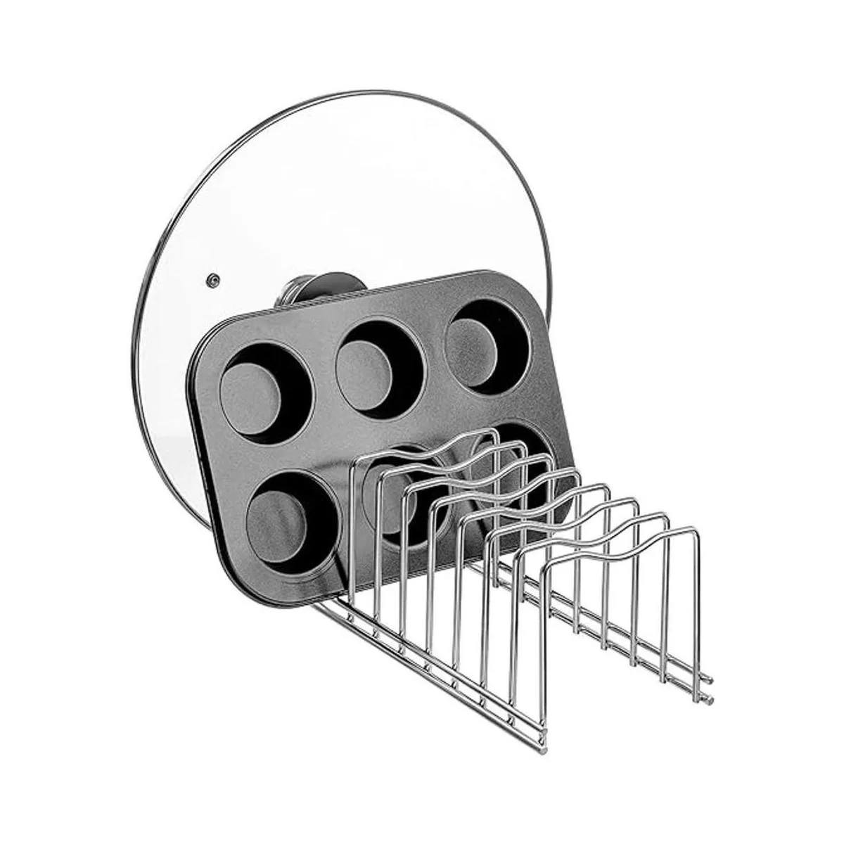 Ampliamente utilizado y almacenamiento: organiza tus ollas, sartenes, hierro fundido, tapas, bandejas de servir y platos para hornear con nuestro soporte resistente para sartenes, te ayudará a ahorrar más espacio en el armario y la encimera en tu cocina.