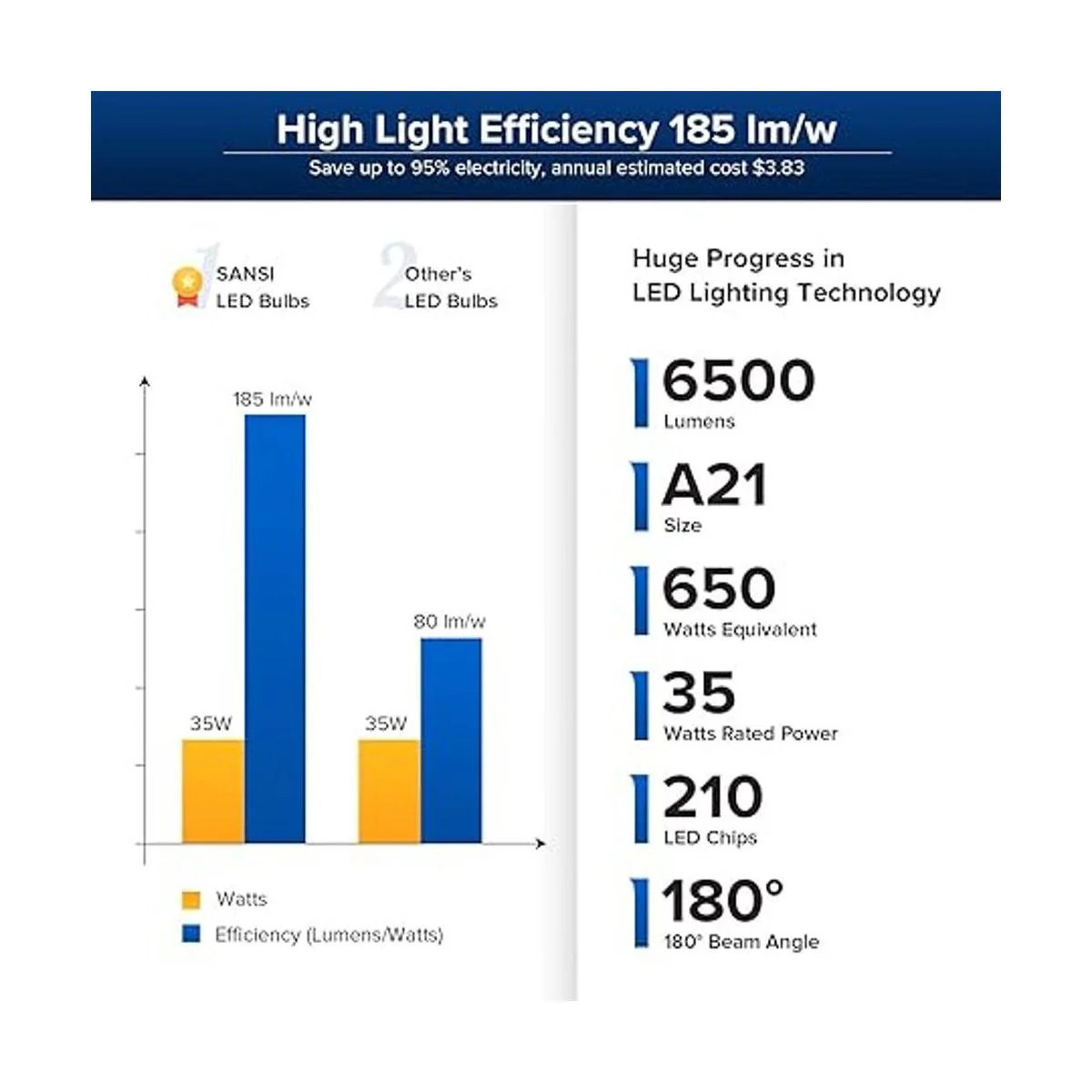 SANSI Bombilla LED A21 de 6500 lúmenes, bombilla LED E26 equivalente a 650 W, luz diurna de 5000 K, no regulable, 25,000 horas, segura de por vida, 35 W, para espacio de trabajo en casa