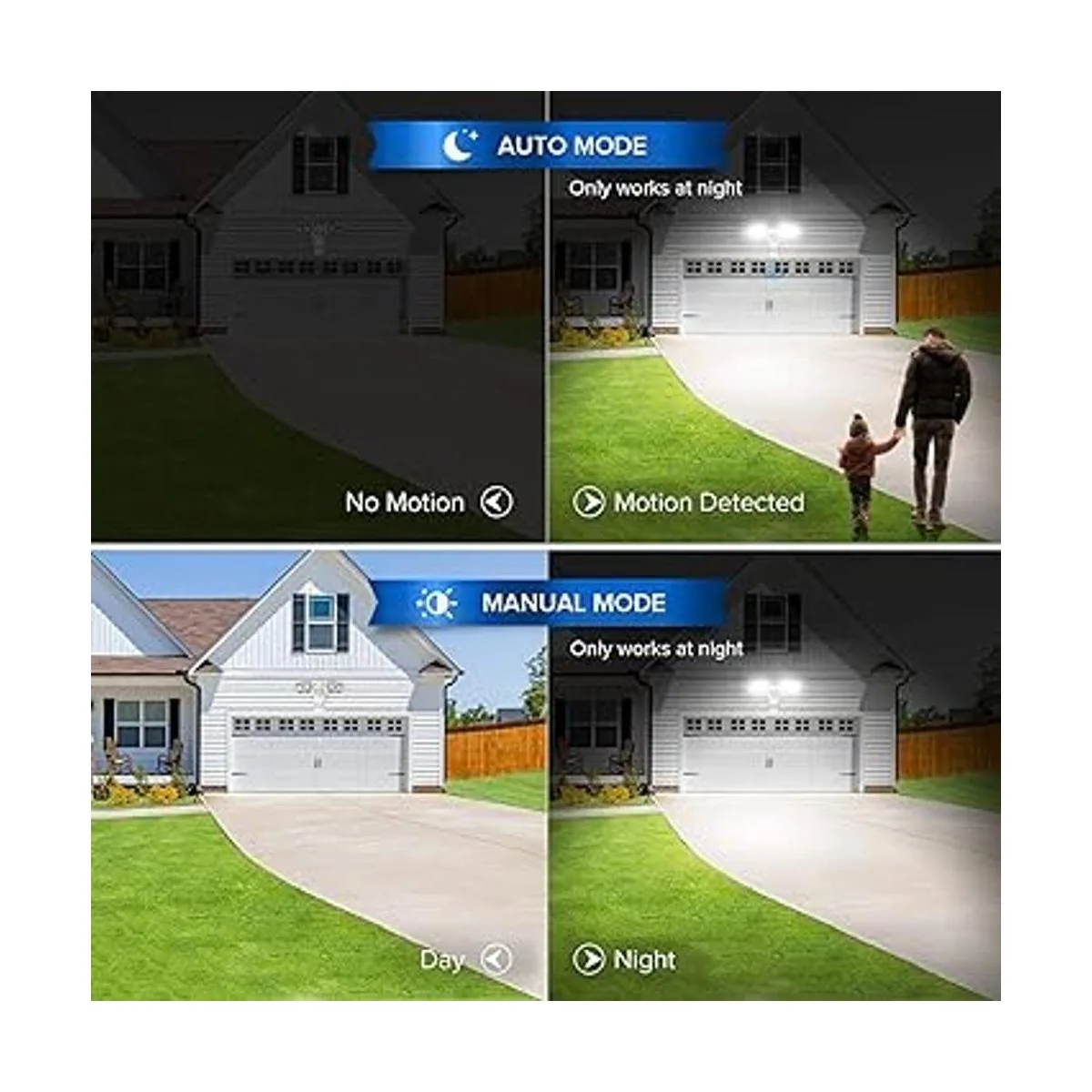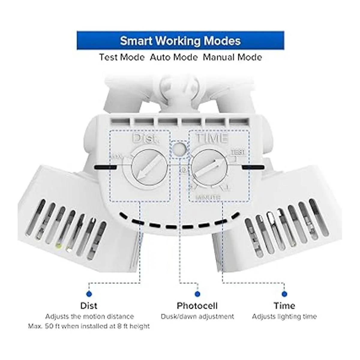 Encendido y apagado automático: la fotocélula del anochecer al amanecer se activa al anochecer y se apaga a la luz del día. Encendido automático cuando se detecta movimiento por la noche, apagado automático después de un tiempo predeterminado cuando no se detecta movimiento adicional. No habrá detección falsa con esta luz. Los niveles de luz y movimiento de detección tienen un rango de 180 grados y hasta 50 pies cuando se monta en la pared de 8 pies de alto.
