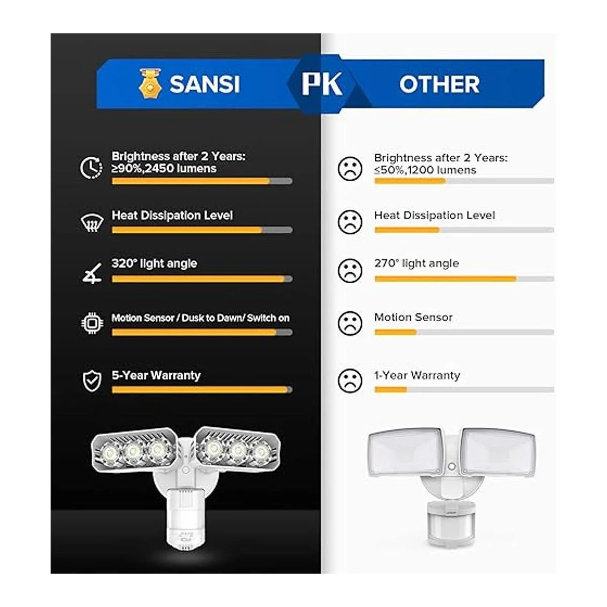 Alto brillo y sostenibilidad: las luces exteriores con sensor de movimiento de la serie Bright proporcionan una iluminación súper brillante de 27 W, 2700 lúmenes para tu entorno de vida exterior. Adopta la tecnología desarrollada por SANSI, proporcionará una vida útil más larga y mantendrá un 90 de brillo después de 2 años de trabajo, en comparación con otras luces perderán más del 50 de brillo.