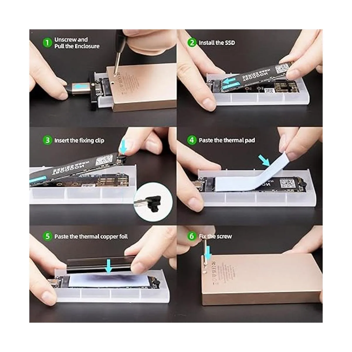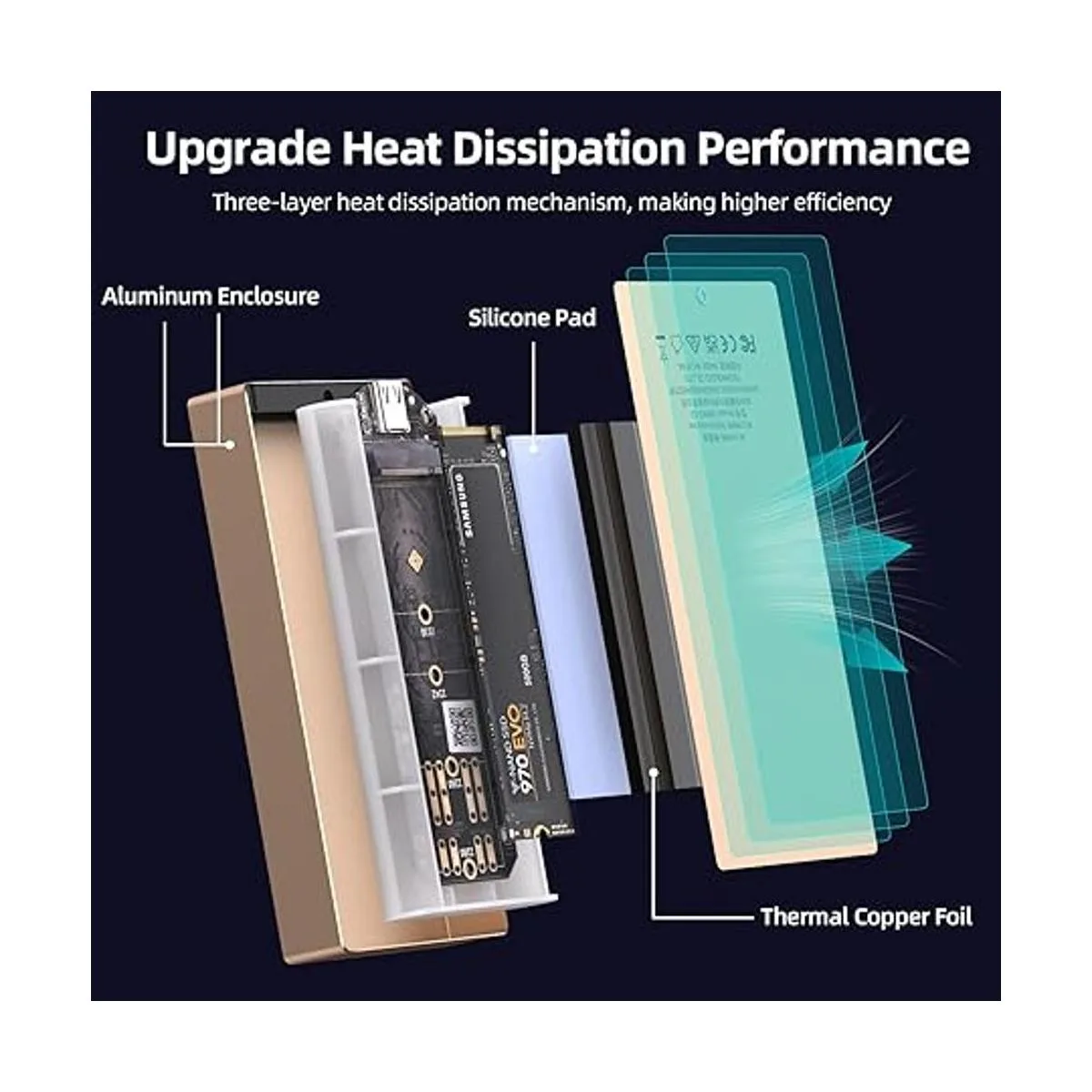 Rendimiento mejorado de disipación de calor: la disipación eficiente del calor es importante para la SSD, no solo puede garantizar velocidades de transferencia estables y no se cae, sino que también prolonga la vida útil de la SSD. La carcasa nvme m.2 tiene un mecanismo de radiación de tres capas en comparación con otros productos. Añadimos un disipador de calor que se añade entre la almohadilla de silicona térmica y la carcasa de aluminio para que el calor emitido por SSD se pueda transmitir rápidamente a la carcasa, y el rendimiento de disipación de calor se mejora de manera más eficiente.
