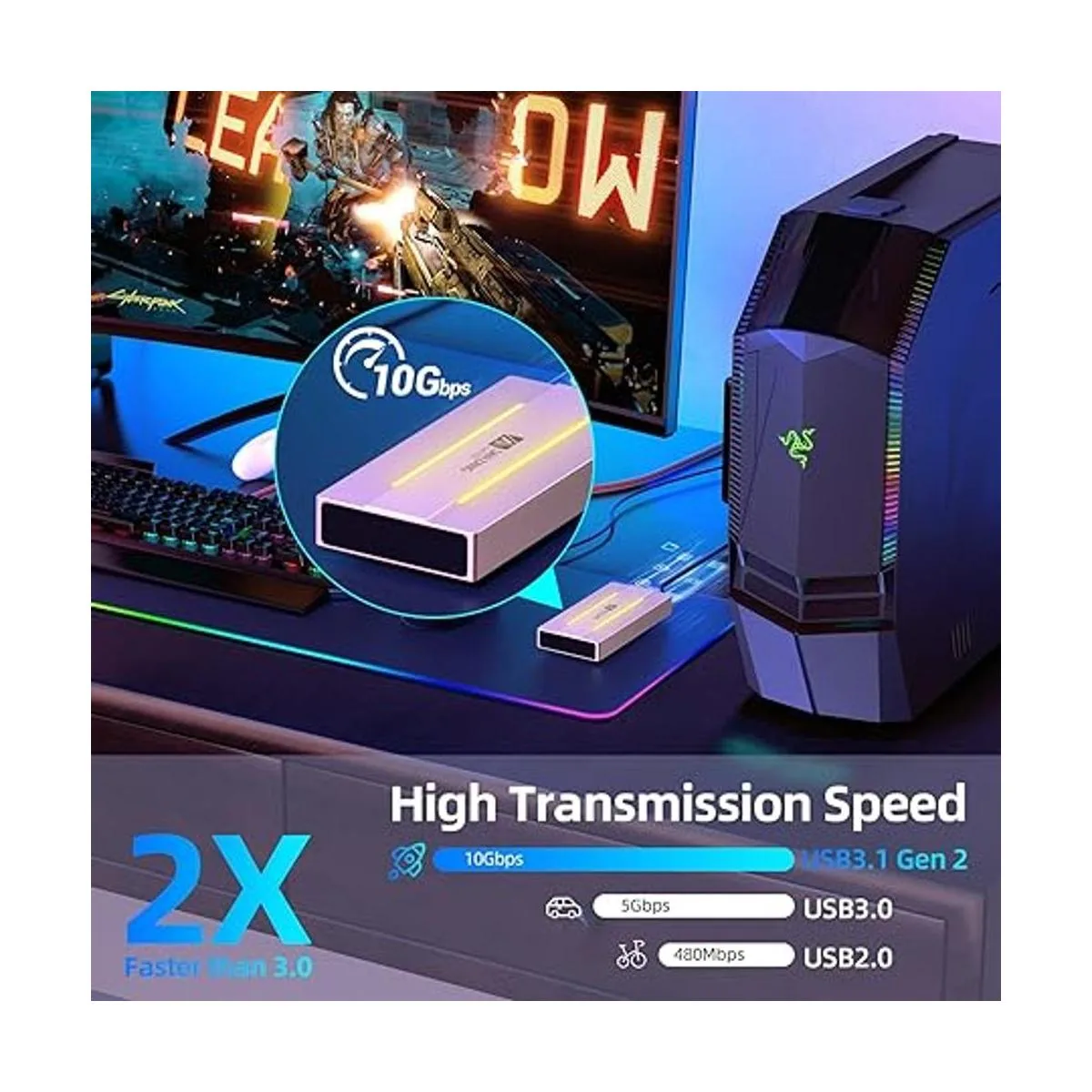 Iluminación RGB brillante multicolor: esta carcasa externa RGB SSD tiene un ambiente más colorido. El rojo, amarillo, verde, azul y morado se cambian alternativamente lentamente durante la espera; parpadea rápidamente durante la lectura y la escritura. La luz azul respira y parpadea durante el sueño. La luz roja respira y parpadea cuando el SSD no está instalado. Simplemente disfruta de tu ambiente de juego personalizado sin preocuparte por las molestas otras cosas.