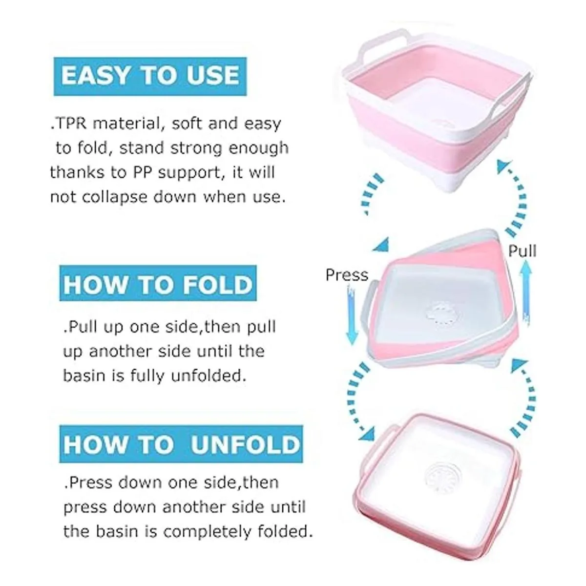 Calidad prémium: el lavabo plegable está hecho de polipropileno de grado alimenticio material TPR, libre de BPA y apto para lavavajillas. Es resistente y duradero, no se agrieta ni se rompe. Viene con una gran capacidad de 9 L para proporcionar un montón de espacio para accesorios.