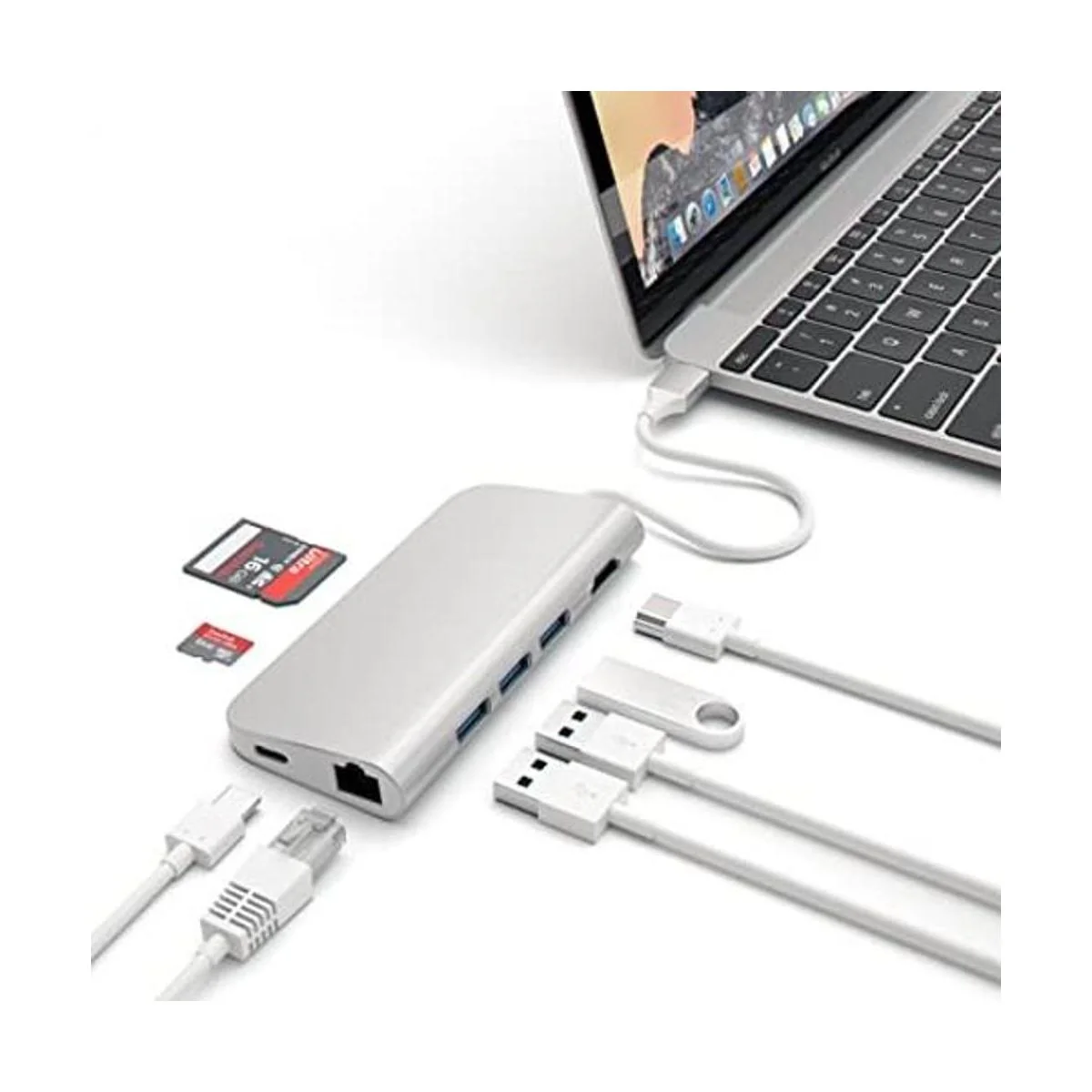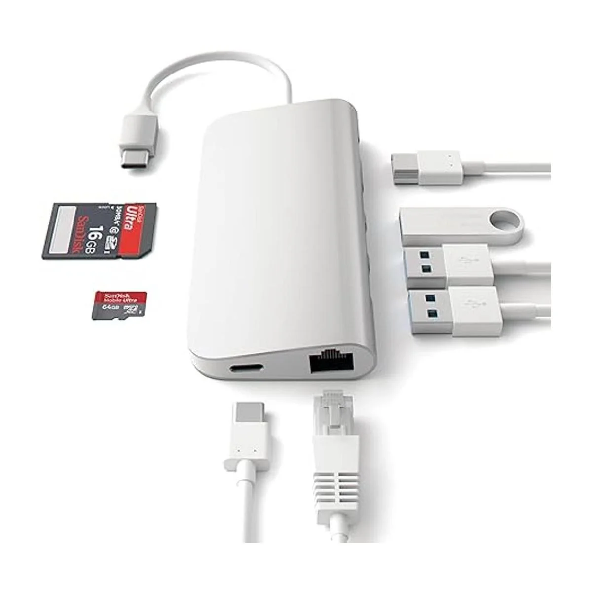 Satechi Adaptador multipuerto de aluminio 4K HDMI, USBC Pass Through, Gigabit Ethernet, lectores de tarjetas SDMicro USB, USB 3.0 Compatible con MacBook Pro Air M1 2020, iPad Pro M1 2021 plata