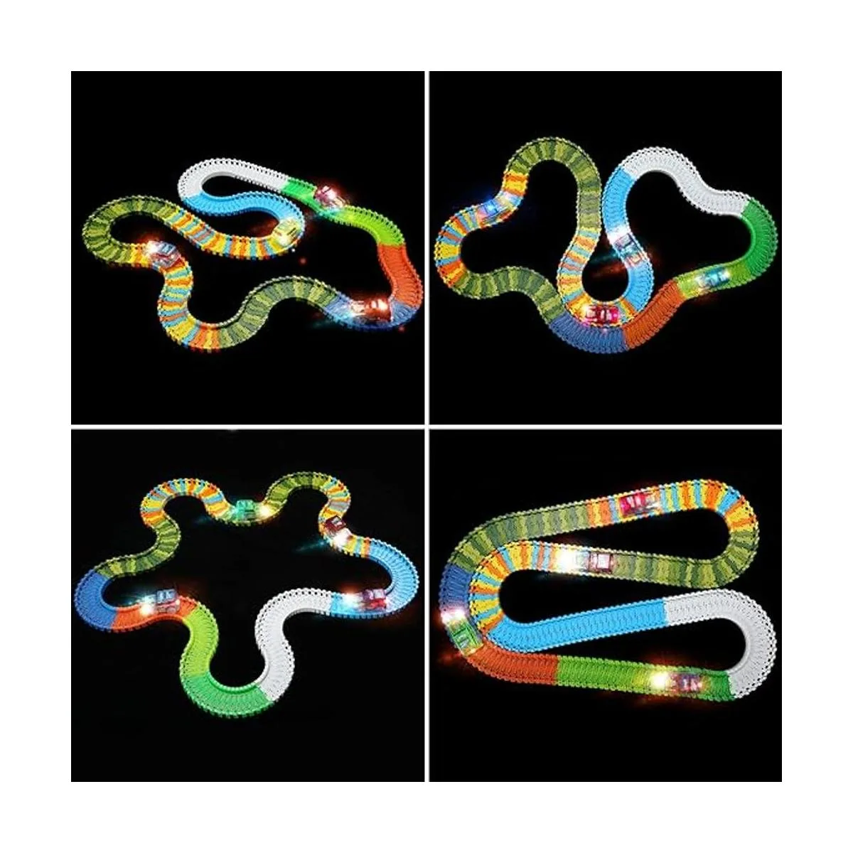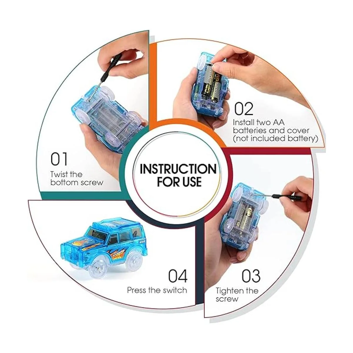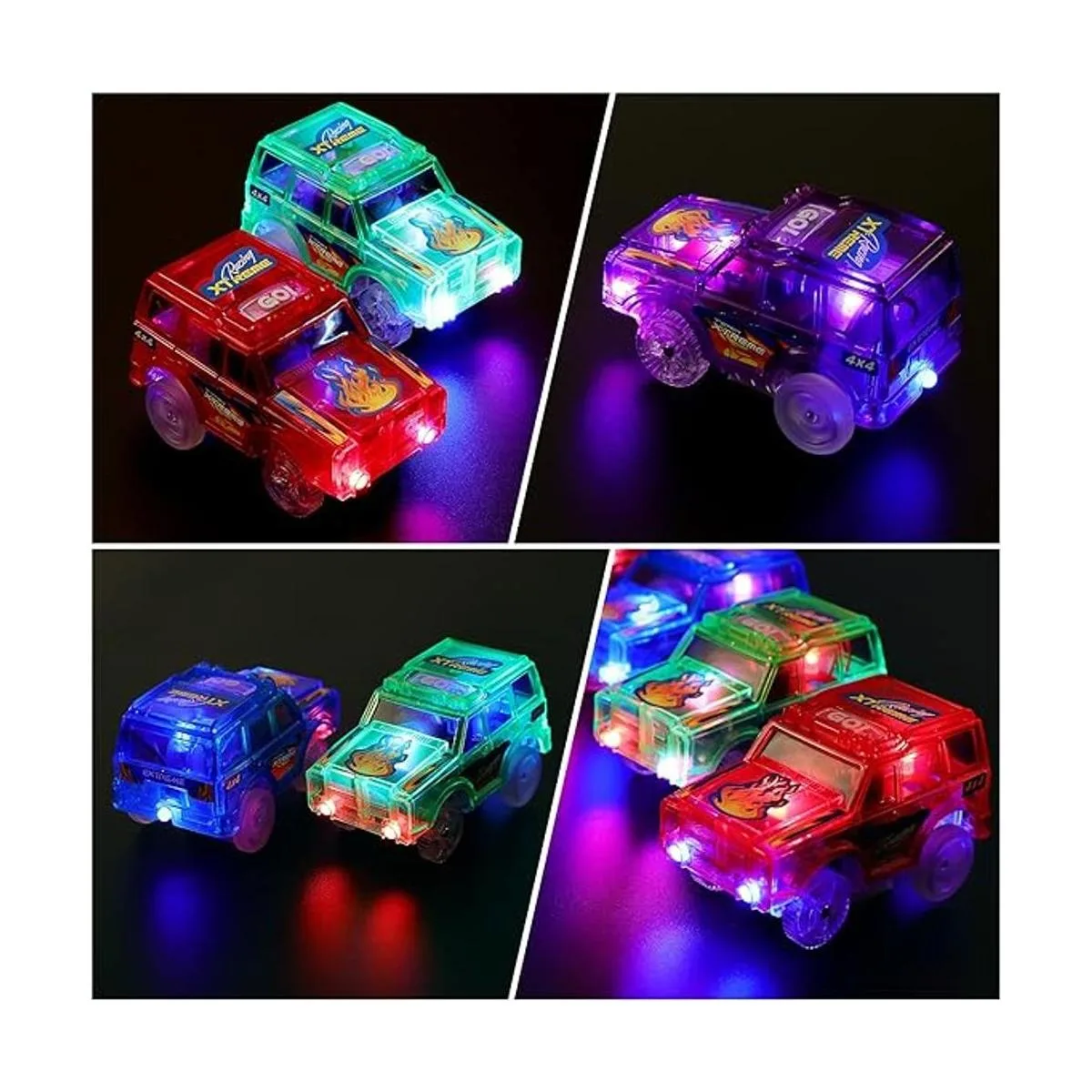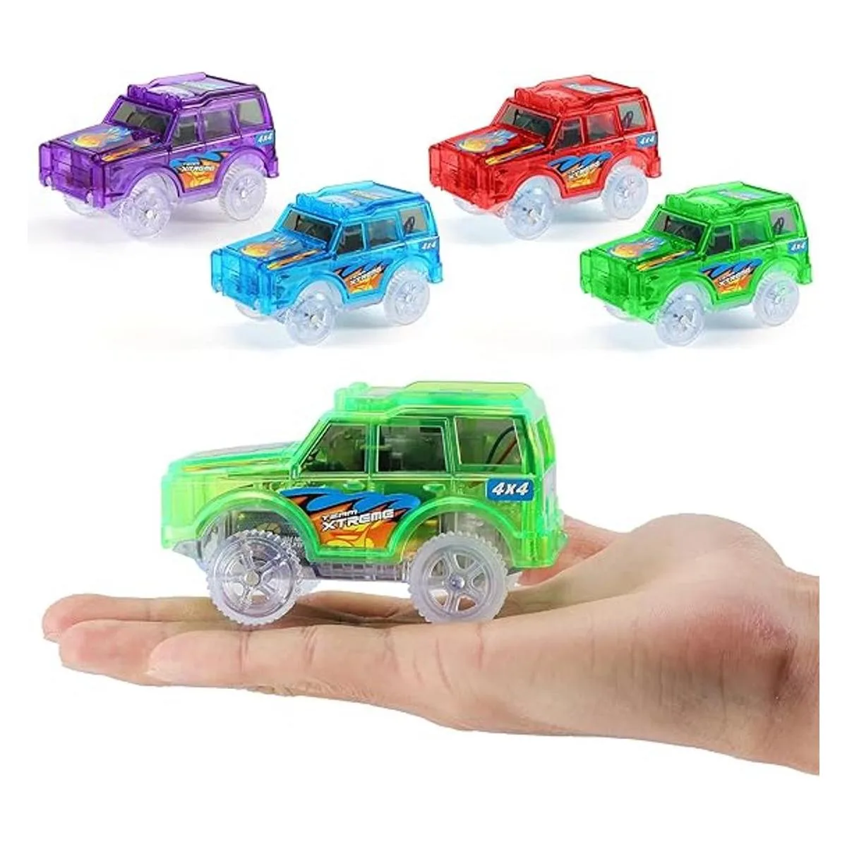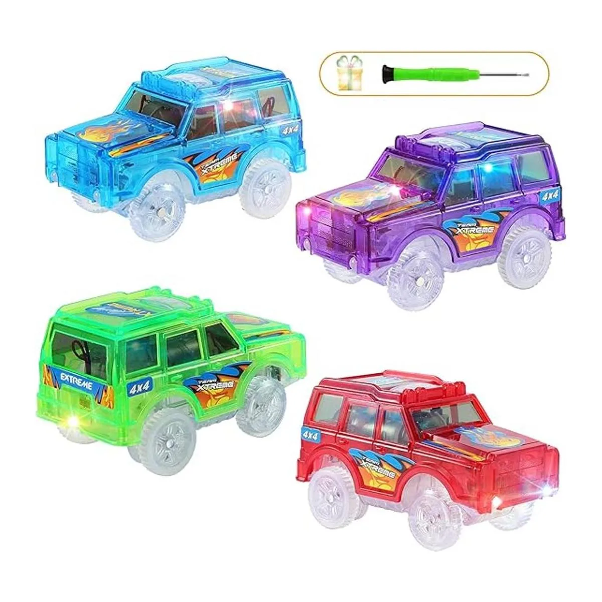 Save Unicorn Rastreadores de coches solo reemplazo, coches de juguete para pistas que brillan en la oscuridad, accesorios de pistas de coche con 5 luces LED intermitentes, compatible con la mayoría de pistas de coche para niños y niñas paquete de 4