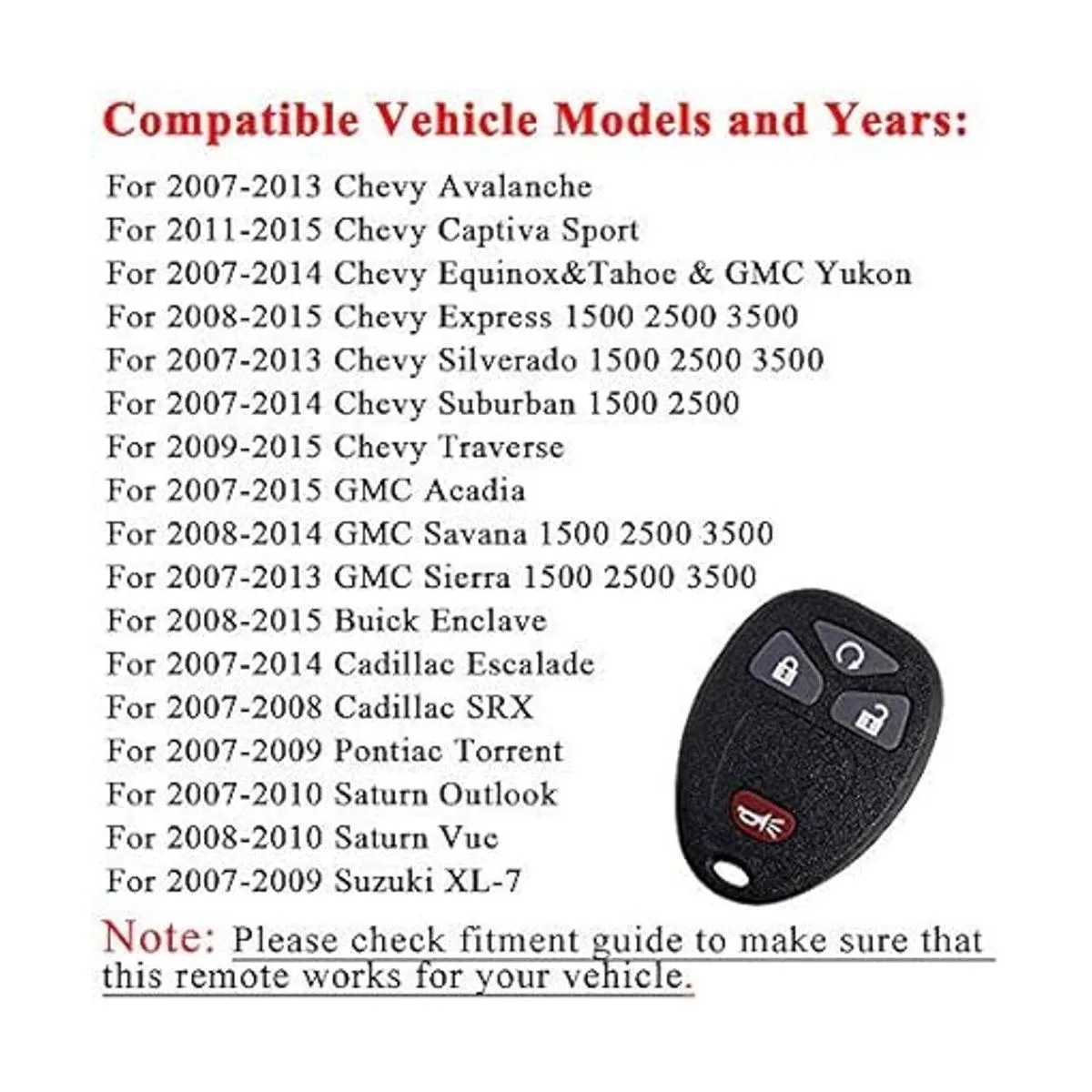 Compatibilidad: este control remoto de entrada sin llave es compatible con Chevrolet Silverado 20072013 GMC Sierra 1500 2500 3500 no compatible con Chevrolet Silverado Classic 2007, Chevrolet Equinox 20072014 Tahoe Suburban 1500 2500 GMC Yukon , 20082008 015 Chevrolet Chevrolet 01Express 1500 2500 3500, Chevrolet Traverse 20092015, Chevrolet Avalanche 20072013, Chevrolet Captiva Sport 20112015, GMC Acadia 20072015, GMC Savana 1500 2500 0 350 350