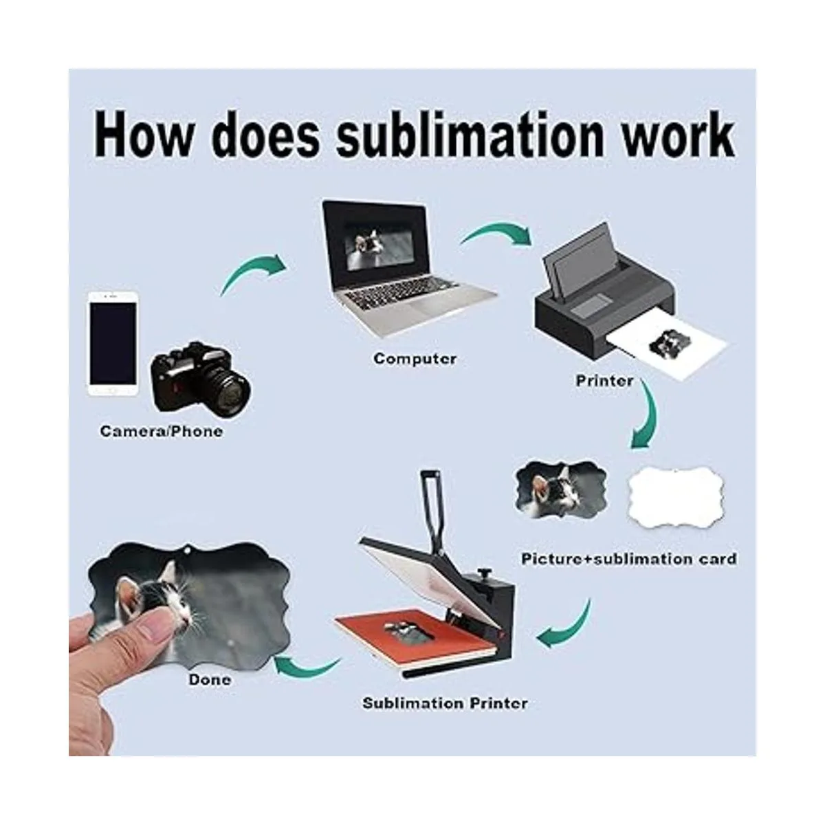 Sublimación de doble cara: la película en ambos lados de los colgantes en blanco se ha arrancado. Así que no necesitas arrancar y simplemente sublimar directamente, muy conveniente para tu operación. Sigue las instrucciones: temperatura: 392.0 F, tiempo: 4560 segundos.