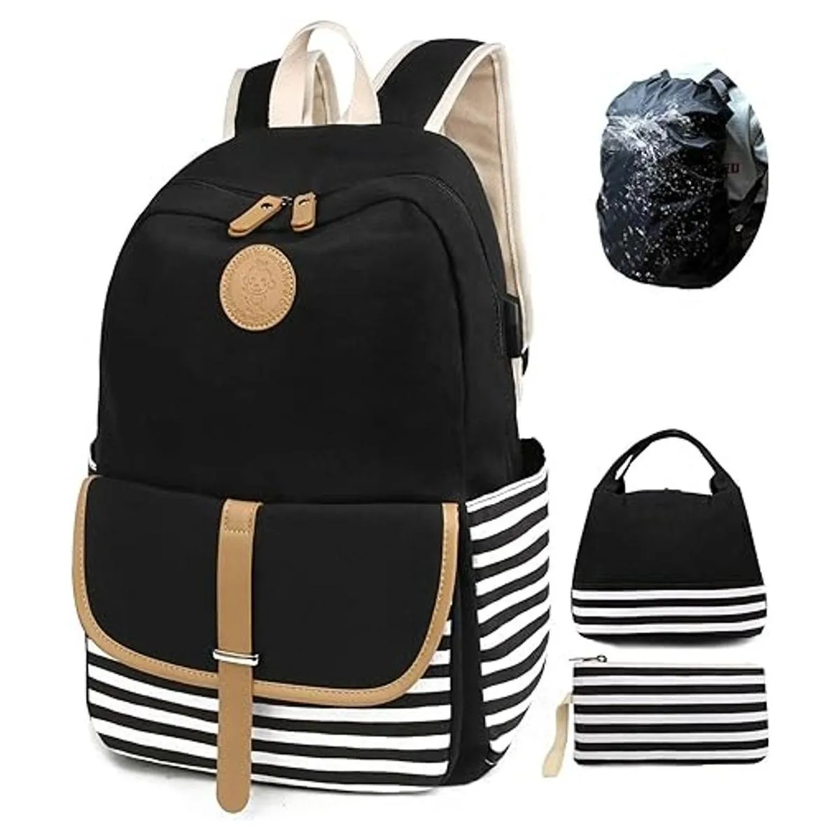 SCIONE Mochilas escolares para mujeres, adolescentes y niñas, con puerto de carga USB y cubierta de lluvia, ligera, de lona a rayas, juego que incluye lonchera aislada y bolsa 3 en 1