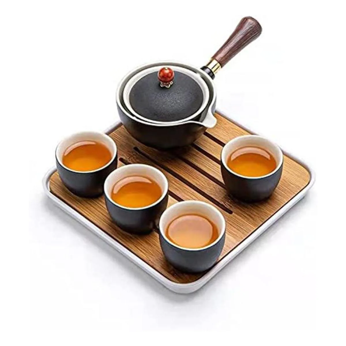 Scizorito Juego de té de viaje portátil de cerámica, juego de té chino Kungfu con 360 tetera e infusor de rotación, 4 tazas de té, bandeja de té de bambú y bolsa de viaje gato de la suerte