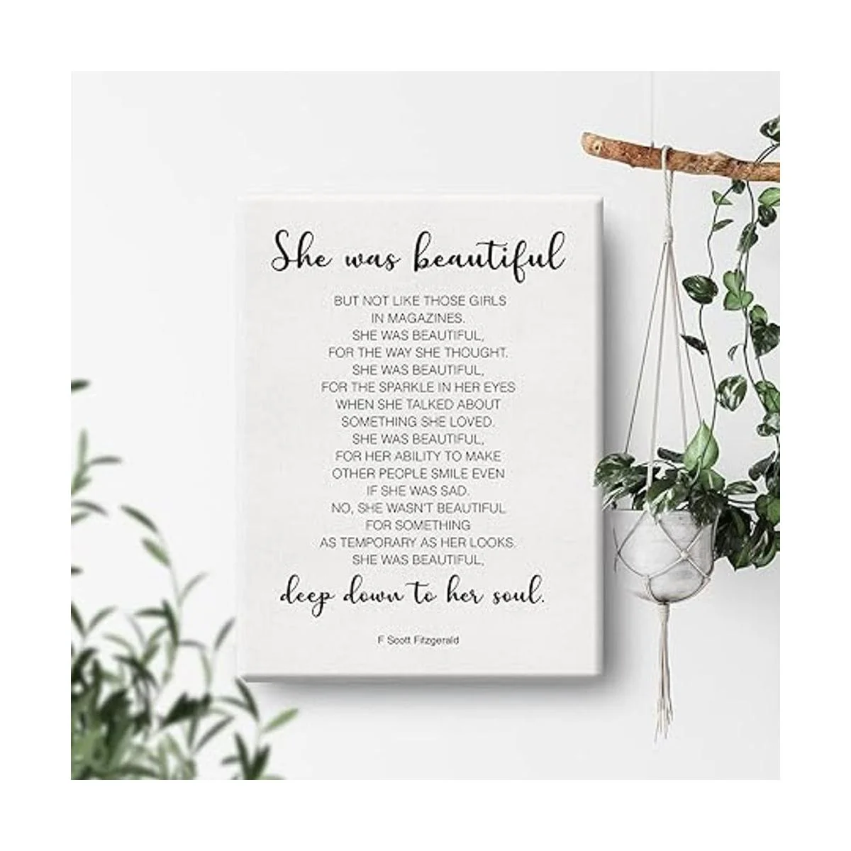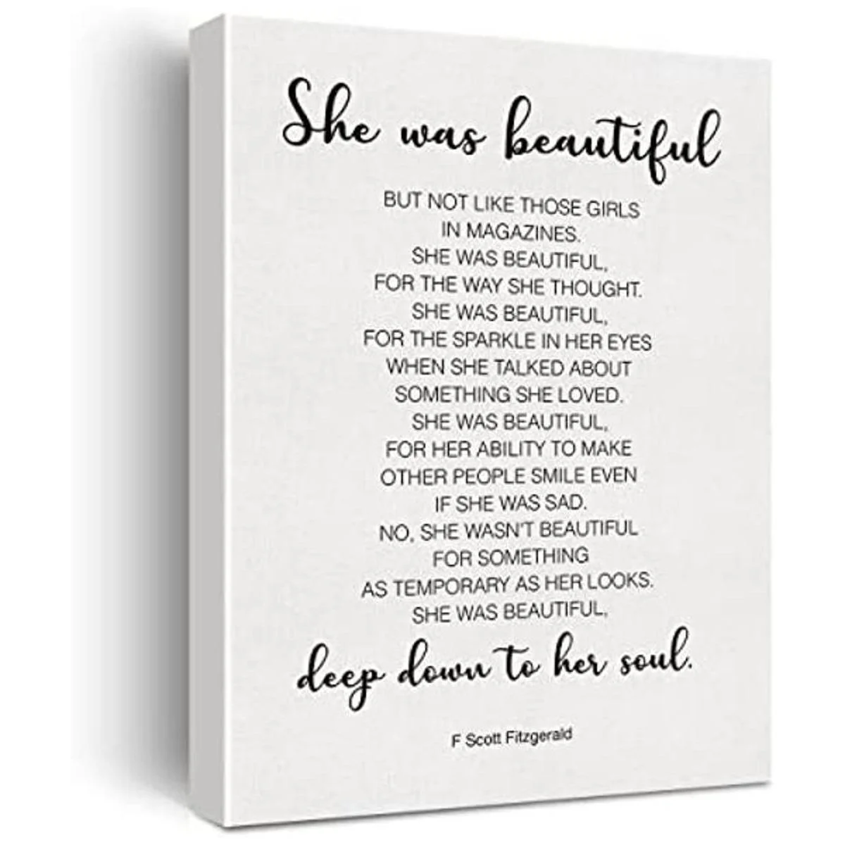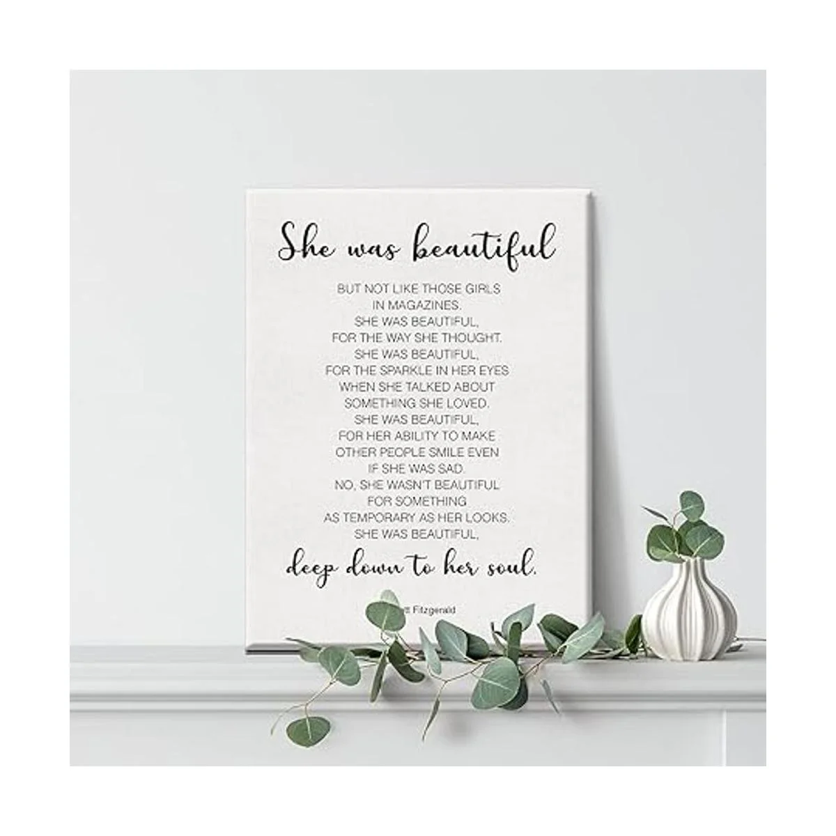 Scott Fitzgerald Lienzo decorativo inspirador para pared, con cita de texto en inglés She Was Beautiful F. Scott Fitzgerald, impresiones de pintura para el hogar, comedor, sala de estar, decoración de pared, regalos enmarcados 12 x 15 pulgadas
