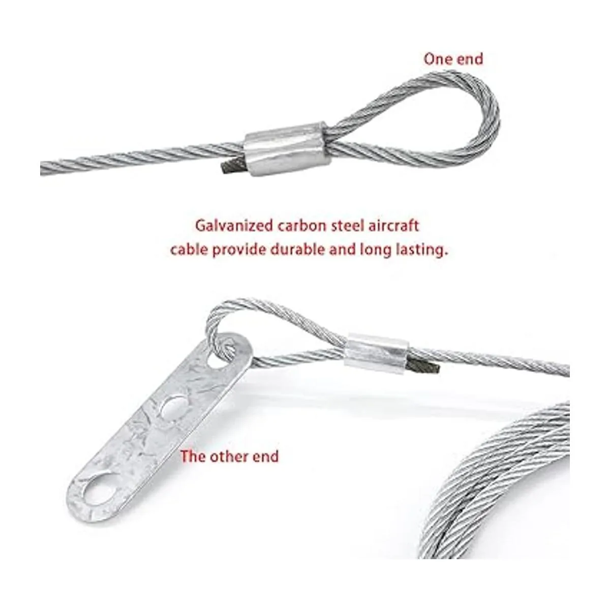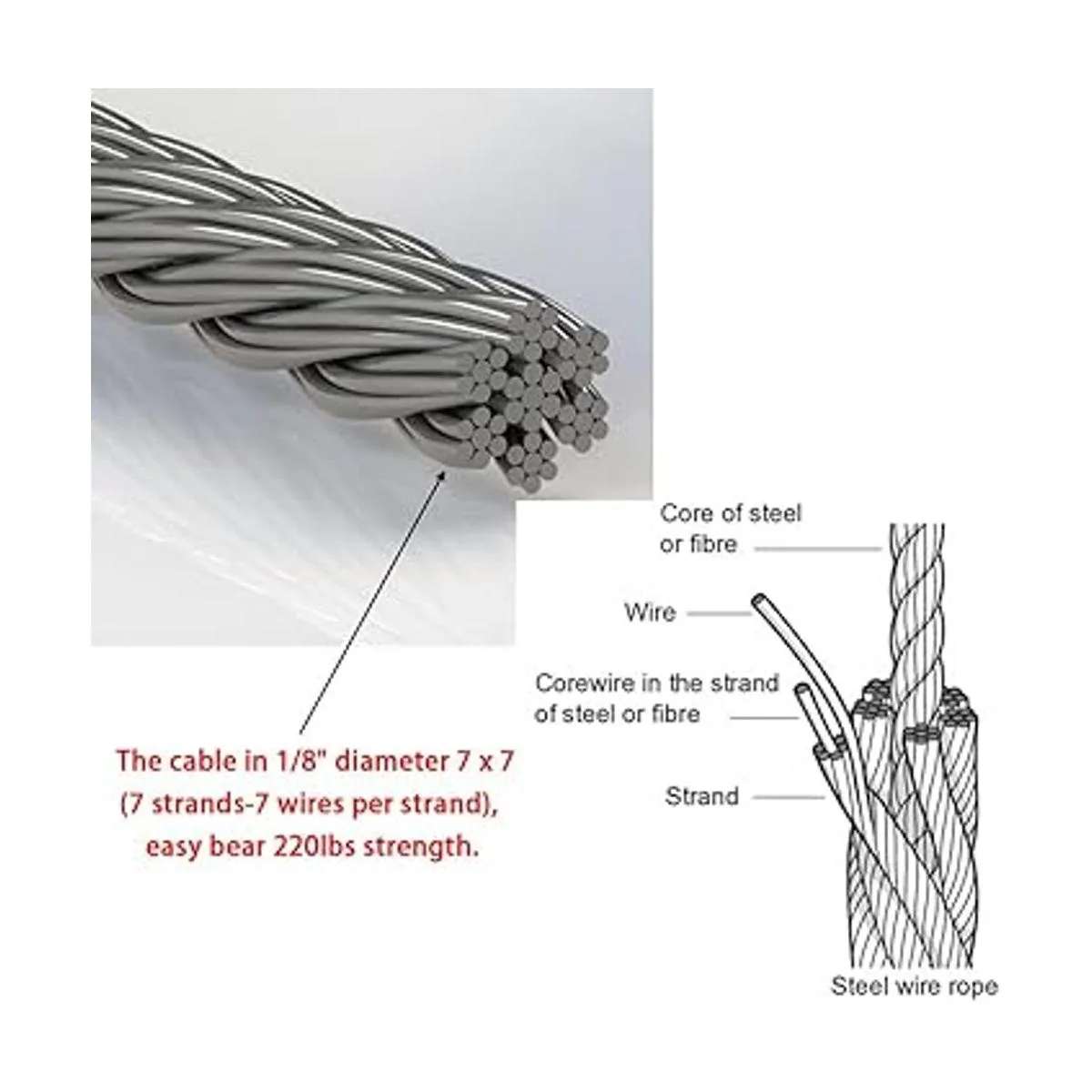 Calidad: fabricado con cable de acero al carbono galvanizado en 1/8 pulgadas de diámetro 7 x 7 7 hebras, 7 cables por hilo, soporta fácilmente 220 libras de resistencia.