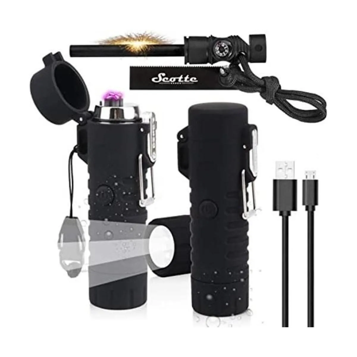 Scotte Encendedor eléctrico de arco de plasma a prueba de viento y linterna LED 2 en 1 negroarrancador de fuego de magnesio 5 en 1 para kits de supervivencia de emergencia, camping, senderismo, varilla de magnesio ferro para todo tipo de clima