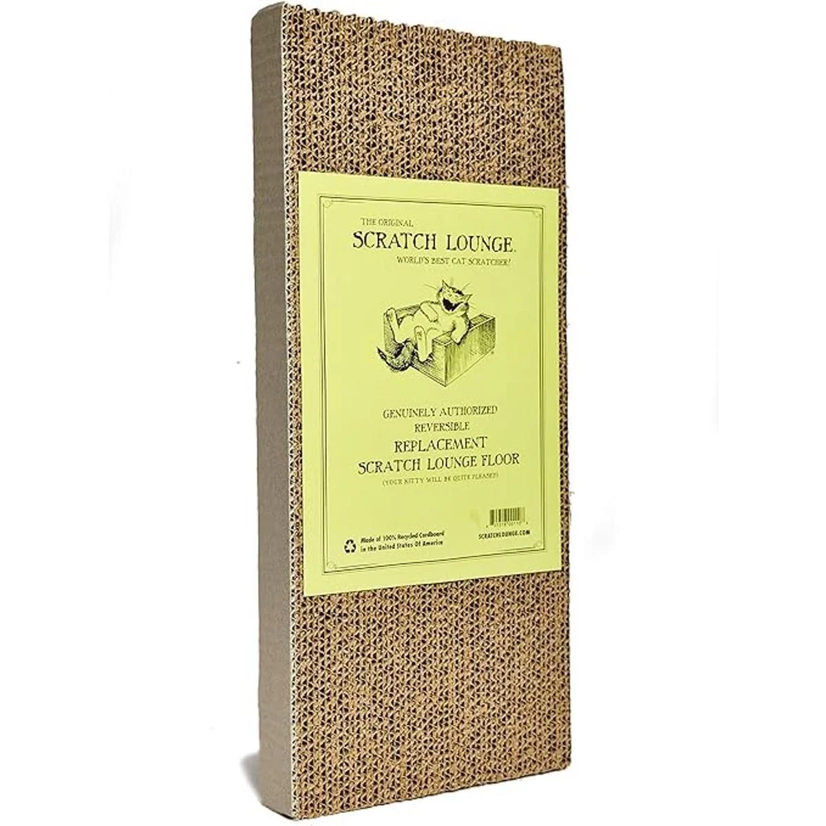 Viene con un salón de cartón reversible, una almohadilla para rascar de repuesto para el suelo también reversible y una punta de gato. Mide aproximadamente 20.9 x 13.0 in.