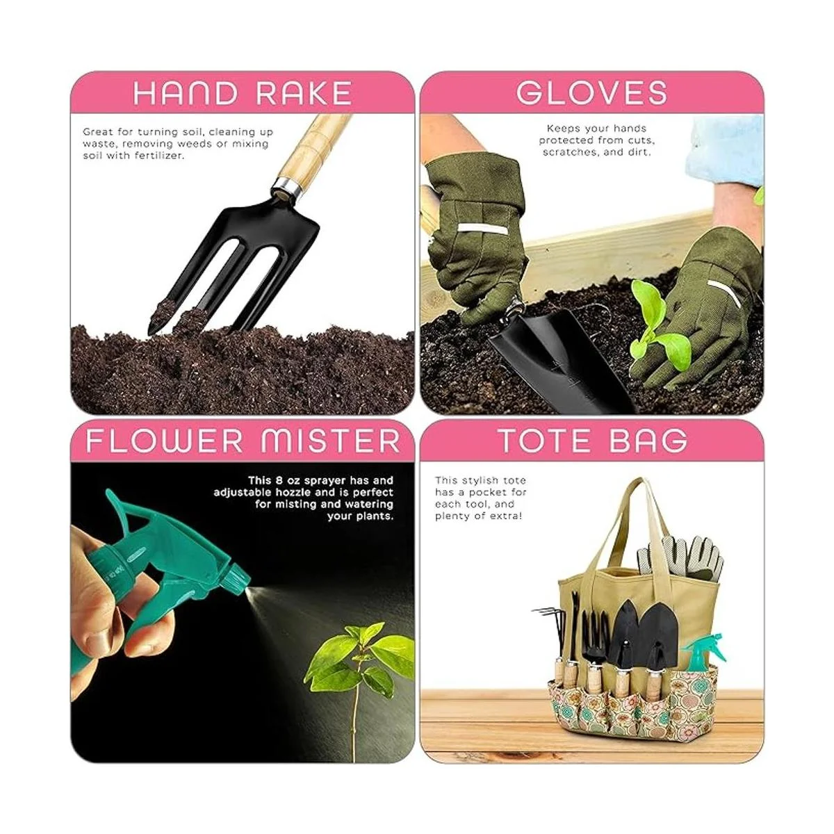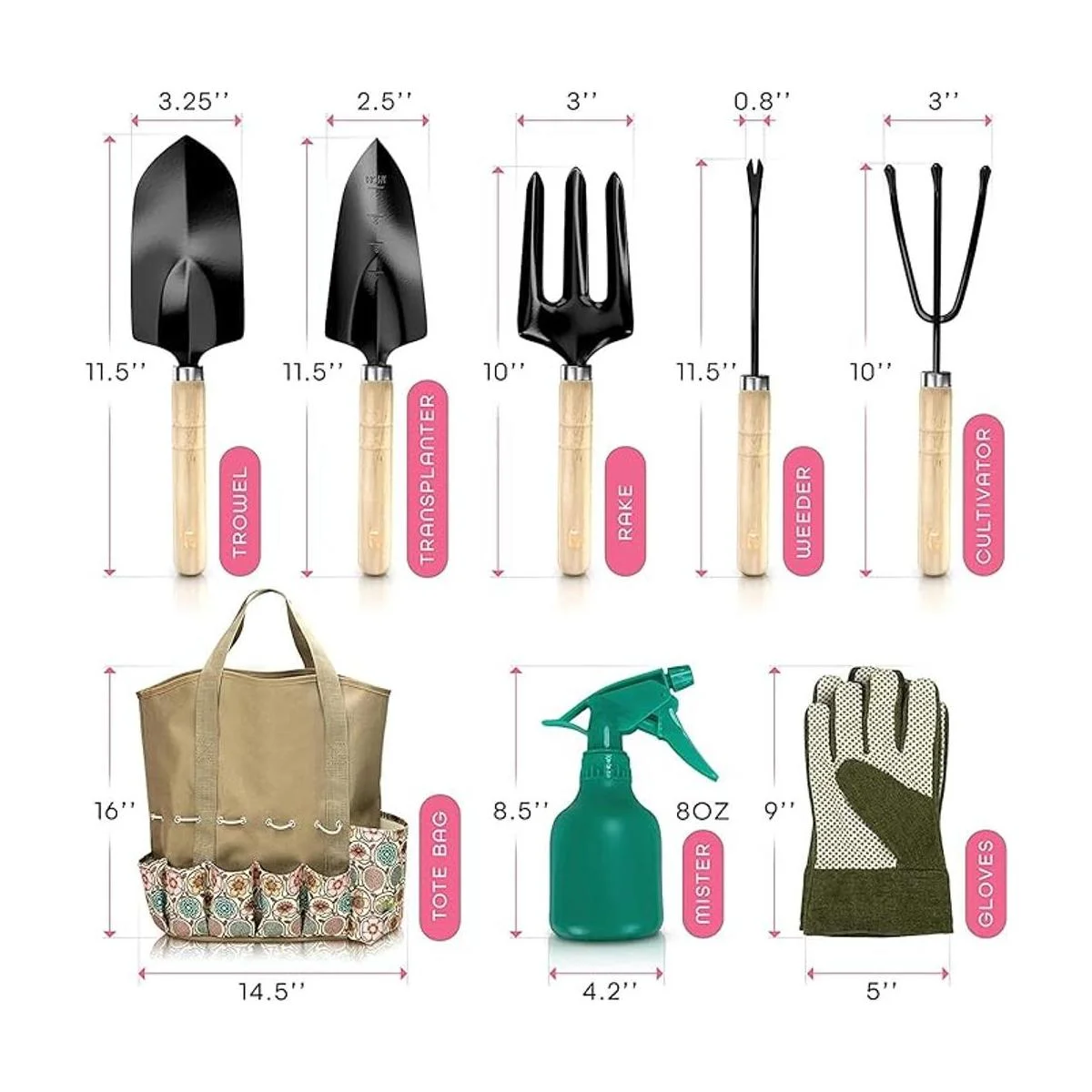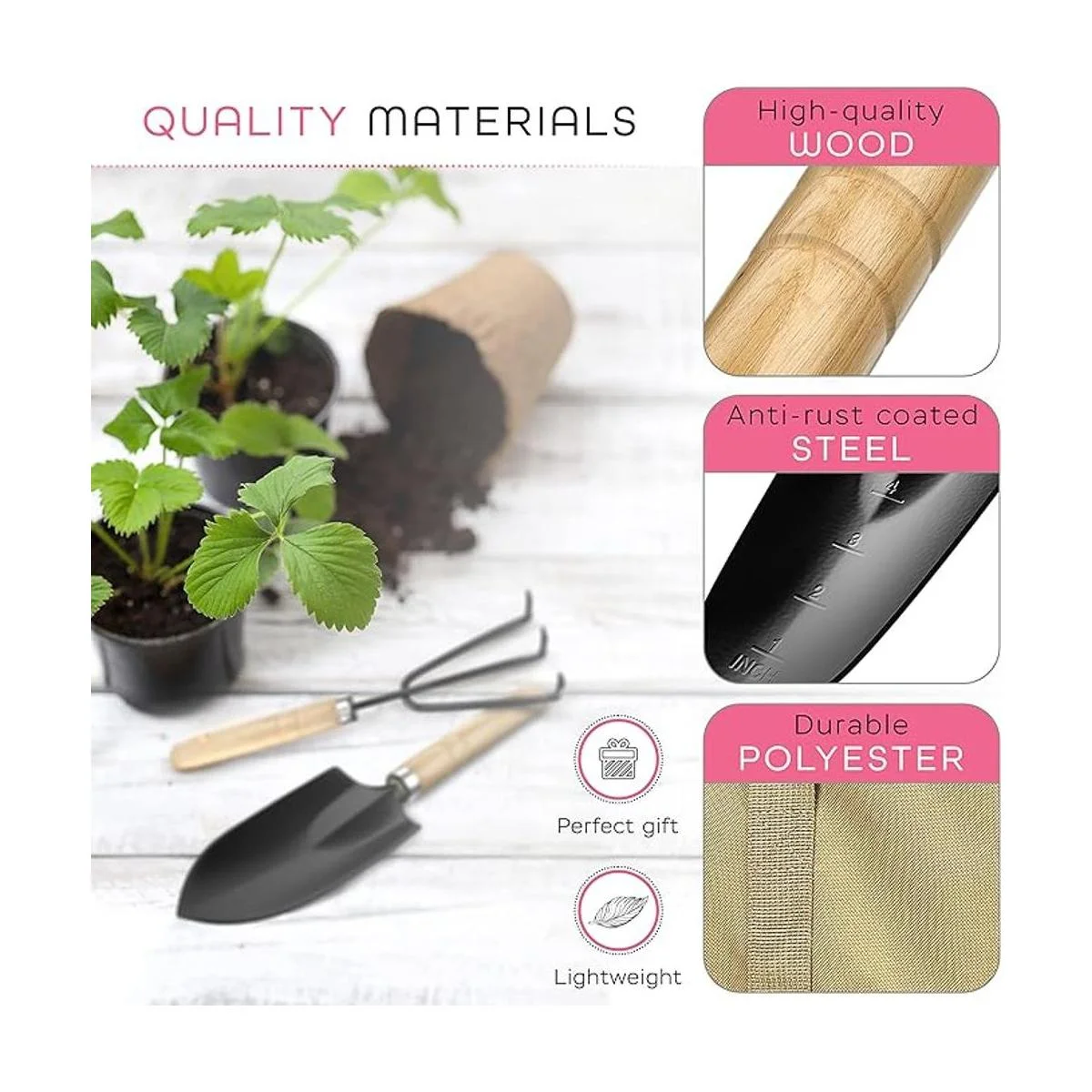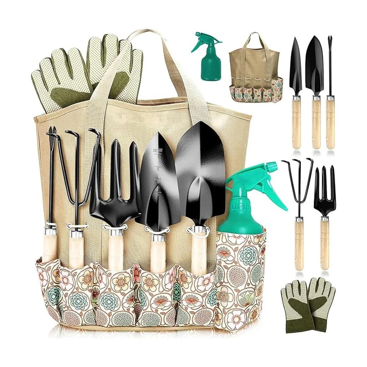 Scuddles SCGB01 juego de herramientas de jardinería de gran resistencia. Bolsa con mango de madera para recolección en jardín kit de rastrillo con agarre ergonómico, palita, aspersor, rastrillo inoxidable, pala para cavar, guante. Regalo ideal para hombre y mujer.