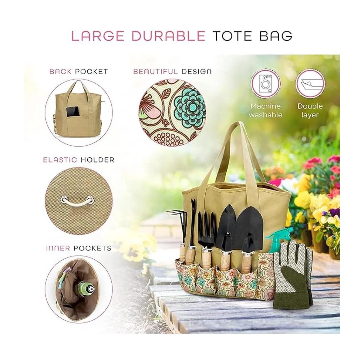 Su juego llega en nuestra con varios bolsillos, tono de la tierra jardín bolsa.