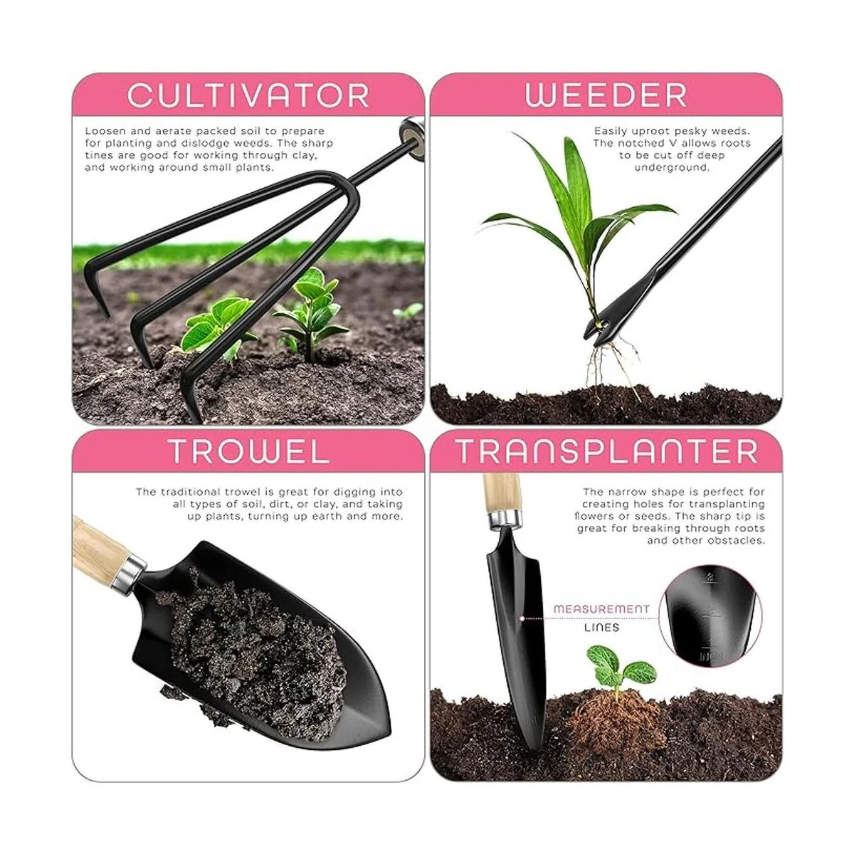 Herramientas característica durable castaluminum cabezas, asas de agarre suave ergonómico y agujeros para colgar para almacenamiento sin enredos.