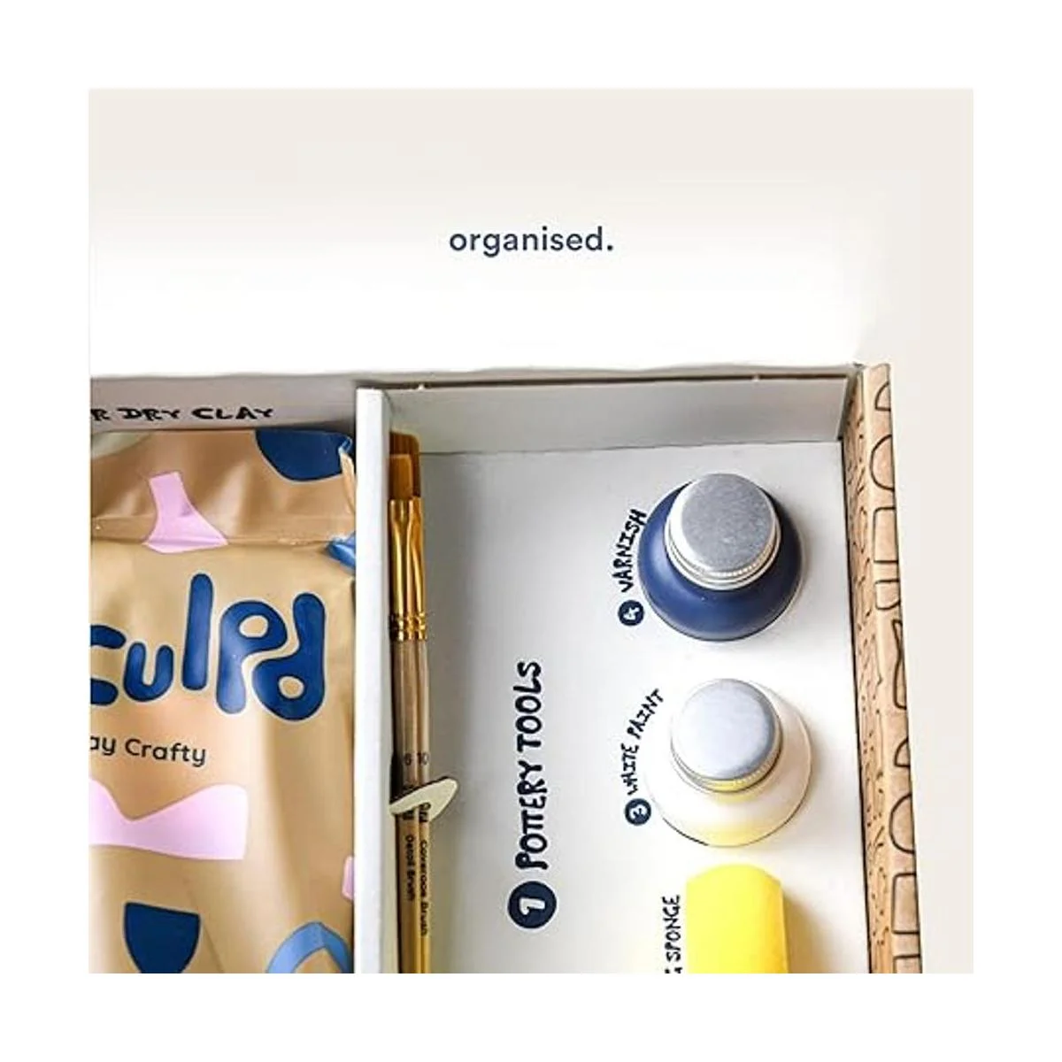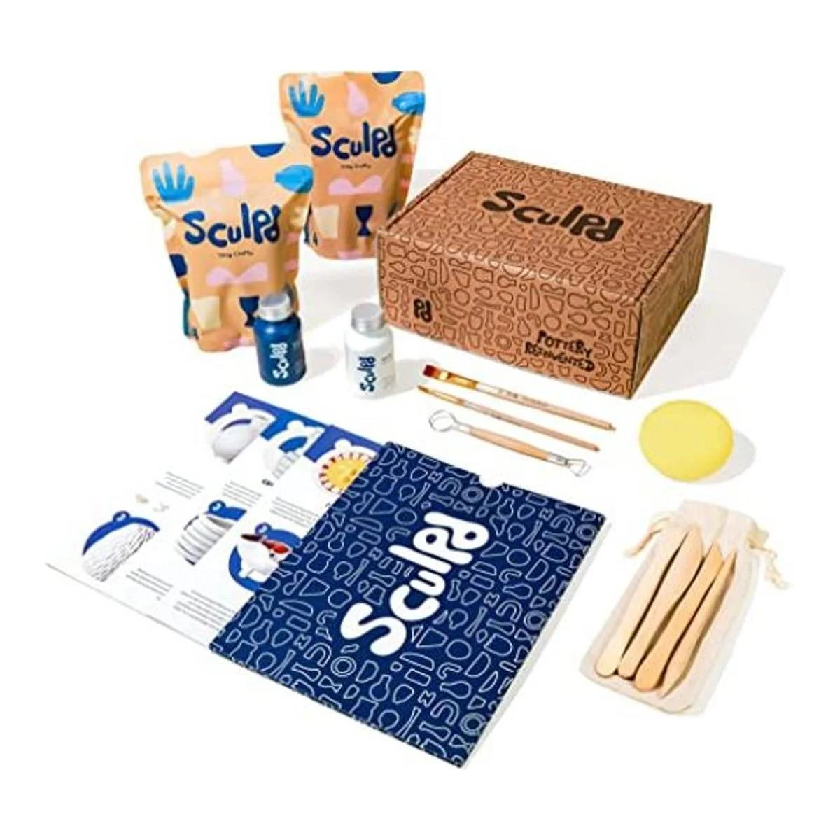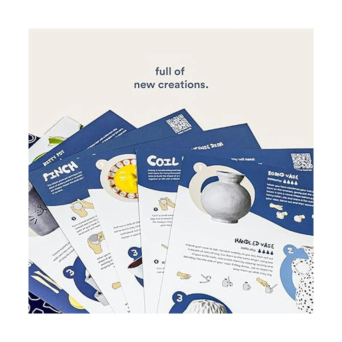 Contiene: 4.4 lbs de arcilla seca al aire, guía de cerámica paso a paso, herramientas de escultura de arcilla, pintura acrílica blanca, barniz mate impermeable, 2 pinceles de cerdas ultrafinas y una esponja para alfareros.