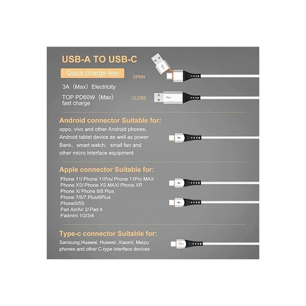 Material de silicona de alta calidad: hecho de material de silicona de alta calidad, es suave y fuerte, una combinación perfecta de tres colores blanco lechoso, negro y naranja, y un diseño especial de alivio del estrés puede soportar más de 10.000 pruebas de flexión. La carcasa brillante de alta calidad hace que el cable sea práctico y hermoso, y tiene las características de resistencia al calor y resistencia a la corrosión. Garantiza una vida útil más larga.